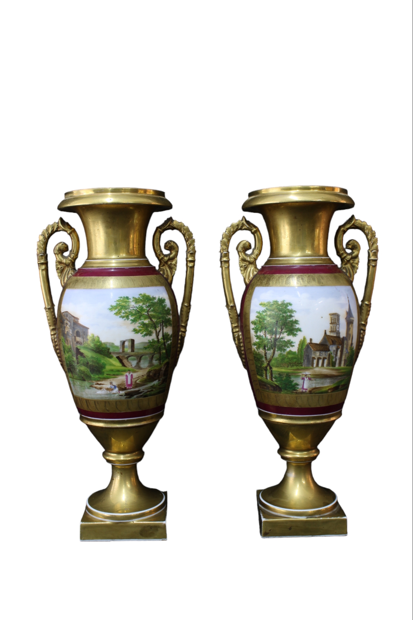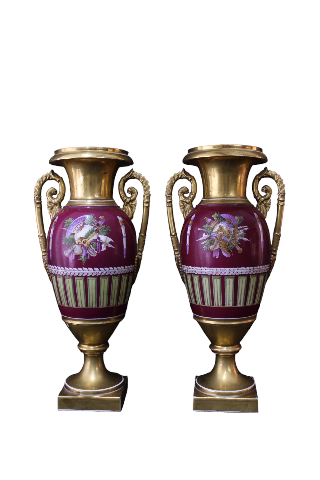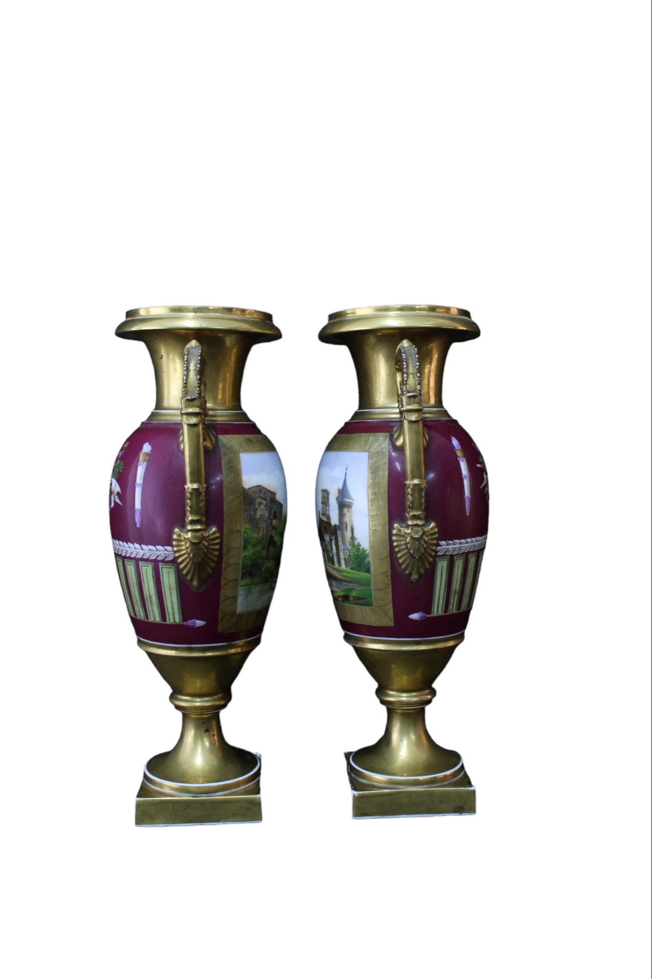 COPPIA DI VASI IMPERO in porcellana dipinta raffigurante sul fronte paesaggio, sul retro trofei e dorato a oro zecchino firmati alla base JEANNE RUE ST LOUIS Francia XIX secolo h cm 39 x 19 x 15