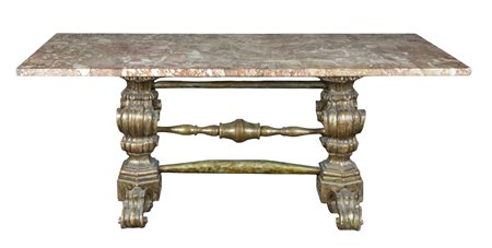 TAVOLINO composto da coppia di elementi in legno tornito e dorato raccordati da assi torniti, piano in marmo XIX secolo h cm 53 x 130 x 60