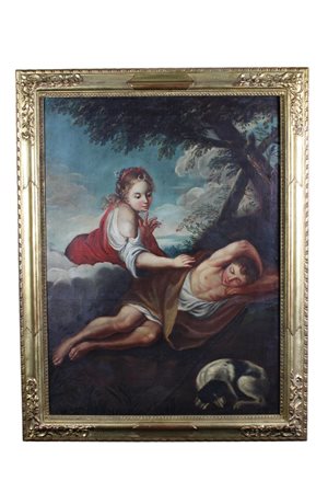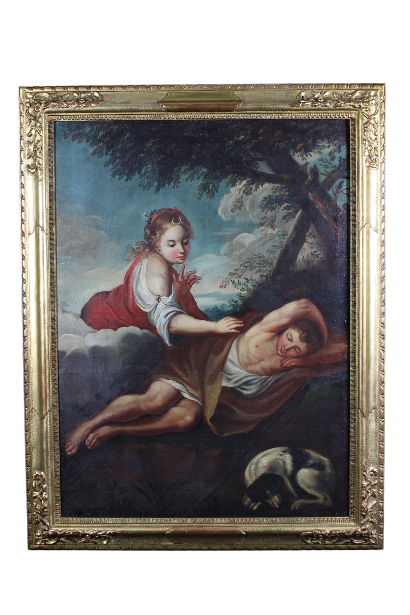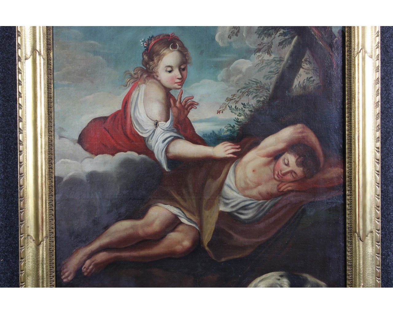OLIO SU TELA raffigurante Diana ed Endimione dentro cornice in legno dorato non coeva scuola italiana XVIII/XIX secolo h cm 102 x 75 / cornice h cm 120 x 93