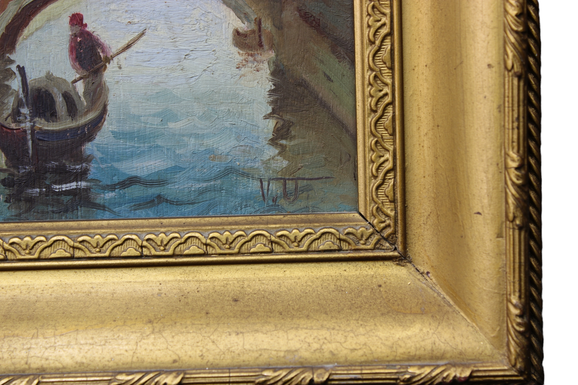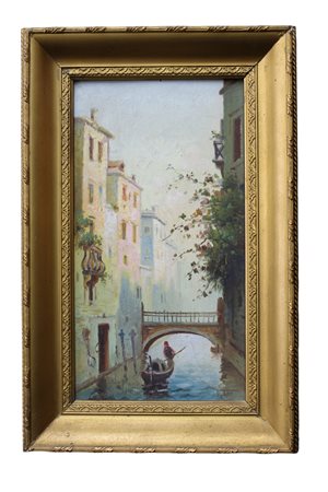 OLIO SU TAVOLETTA raffigurante gondoliere su canale veneziano firmato V. Udine (Palermo 1898-1981) h cm 36 x 20 / cornice h cm 47 x 30