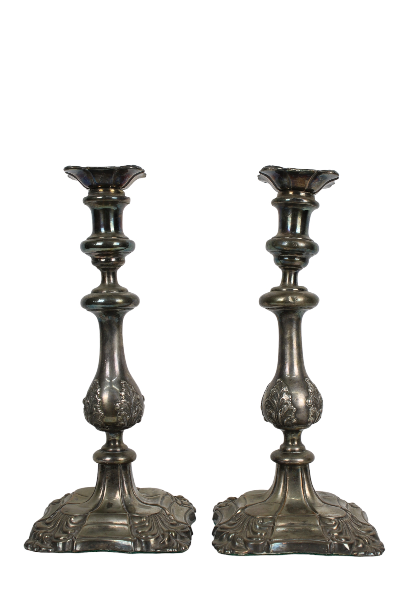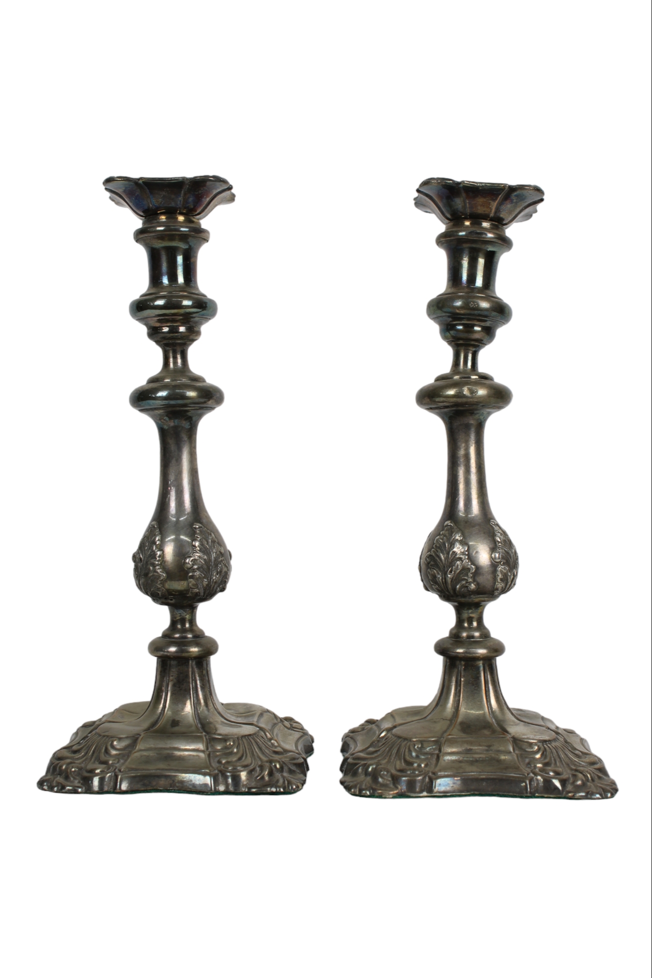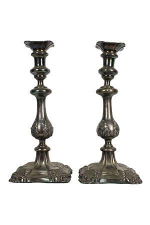 COPPIA DI CANDELABRI MONOCERA in metallo sbalzato cesellato e argentato Italia XIX secolo h cm 31 x 14 x 14