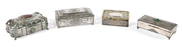 Lotto composto da quattro scatole cesellate con coperchio incernierato, tre in argento e una in metallo.