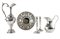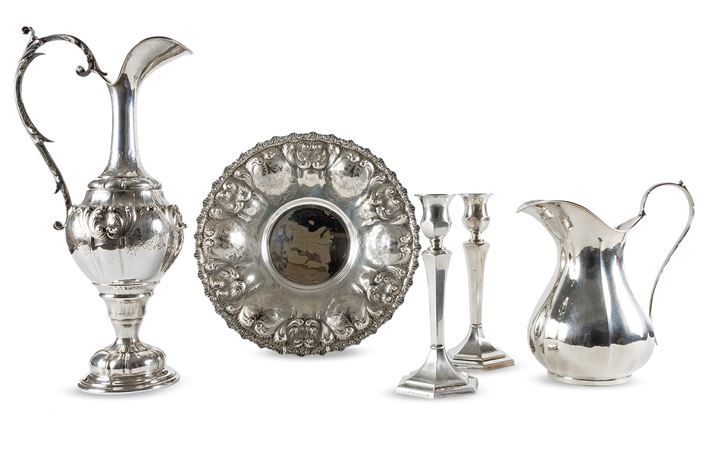 Lotto composto da cinque oggetti in argento: una coppia di candelieri, argento 925/1000, firmati "Pampaloni"; una brocca con piatto lavorati a mano, firmati "Costante Provenghi"; una brocca battuta a mano