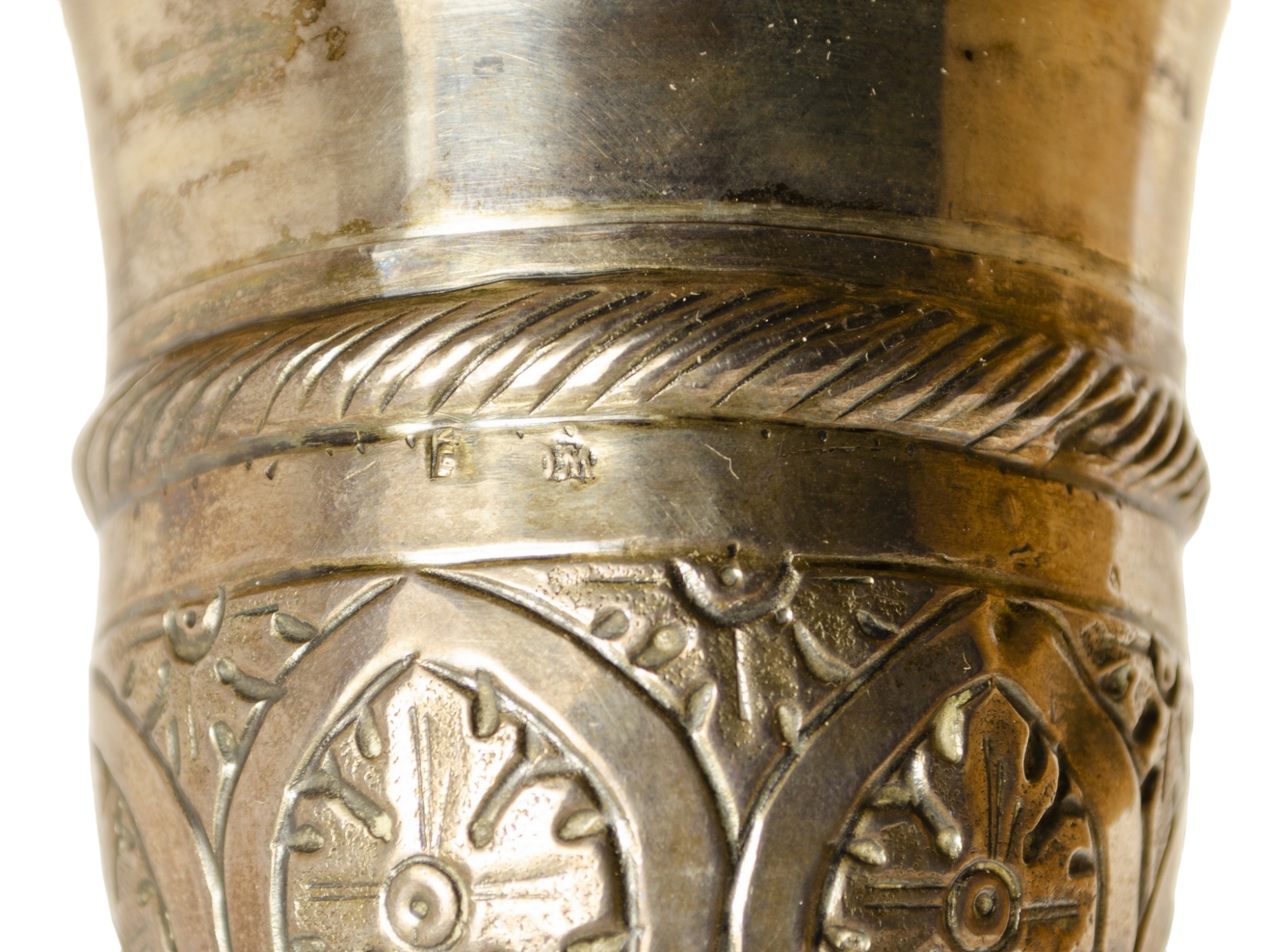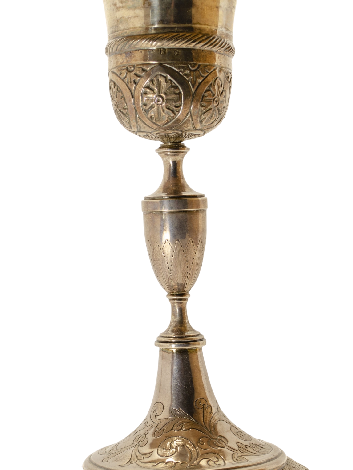 CALICE in argento Finemente cesellato a motivi vegetali e girali , base circolare reca dedica incisa con scritta postuma , grammi 250 Italia XIX secolo h cm 23,5 x Ø 11,5