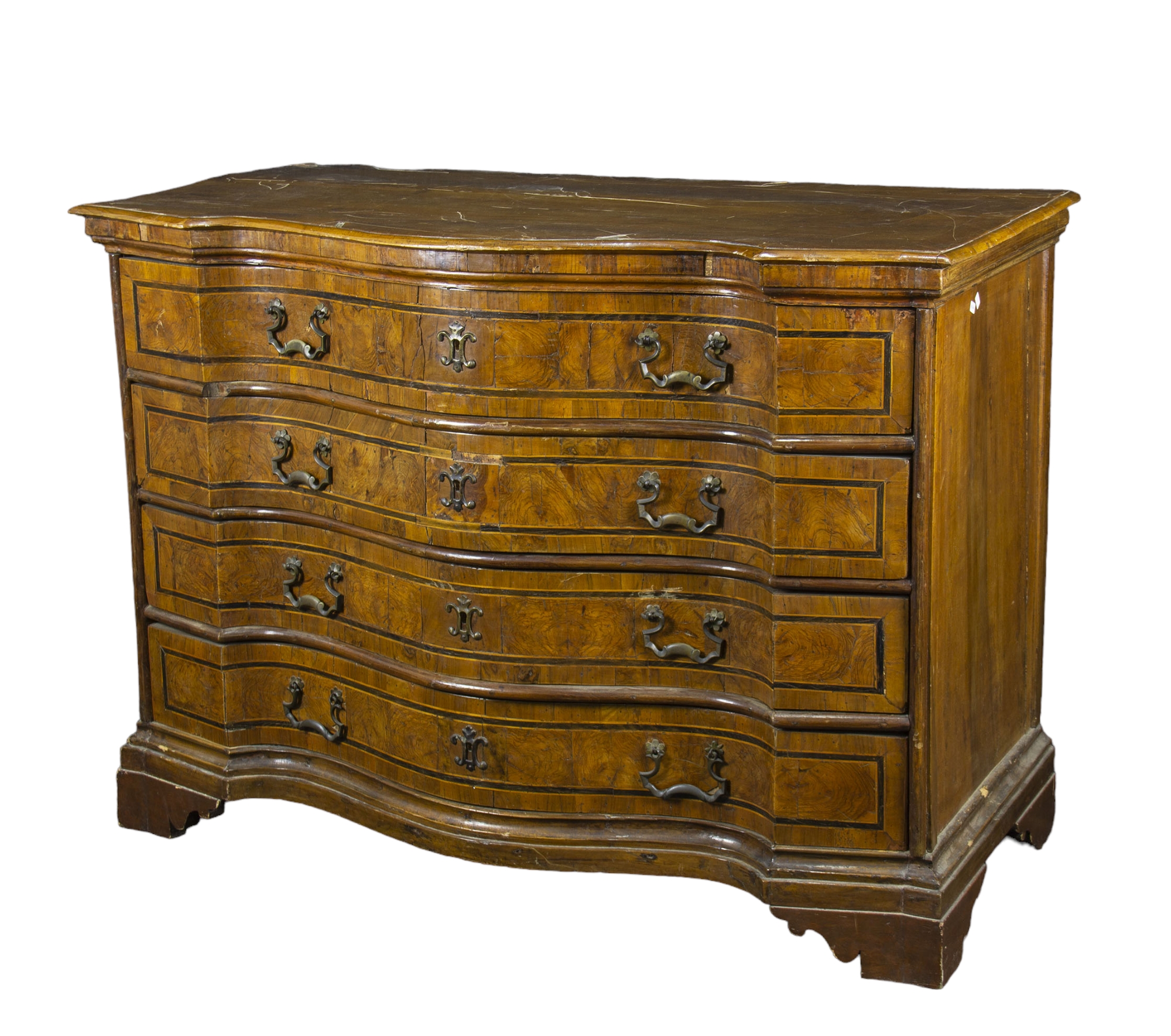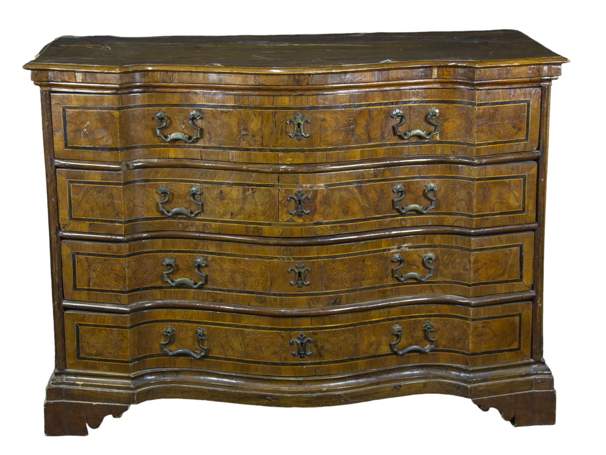 CASSETTONE lastronato di noce e radica di noce, mosso sul fronte, tiretti decorati da cornice a doppia filettatura, piedi a mensola Veneto XVIII secolo h cm 101 x 138 x 70