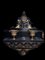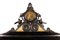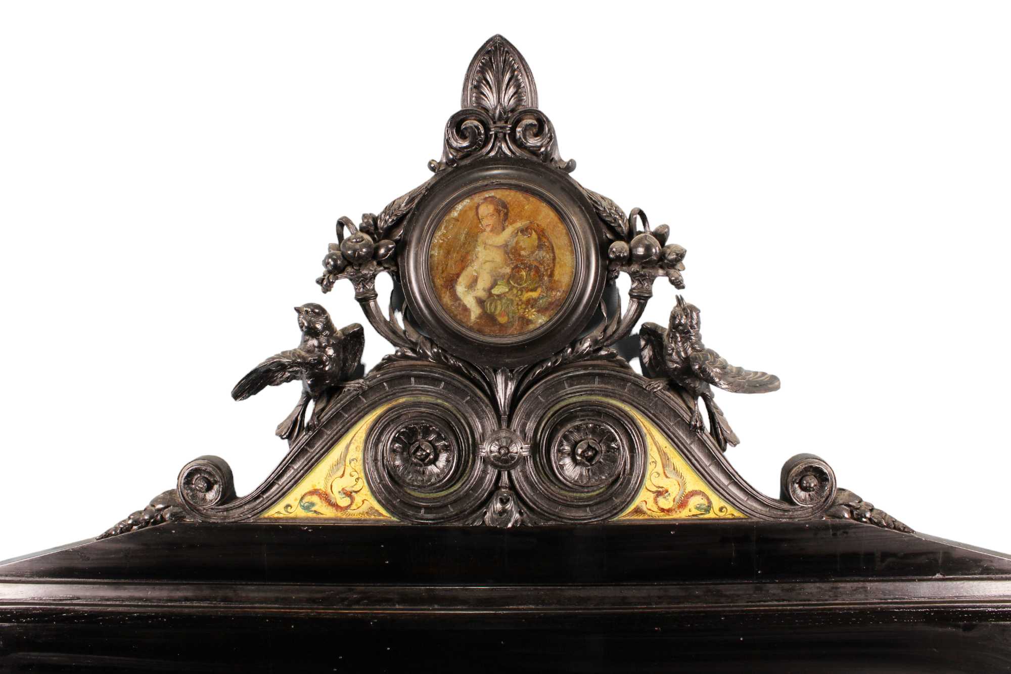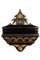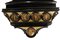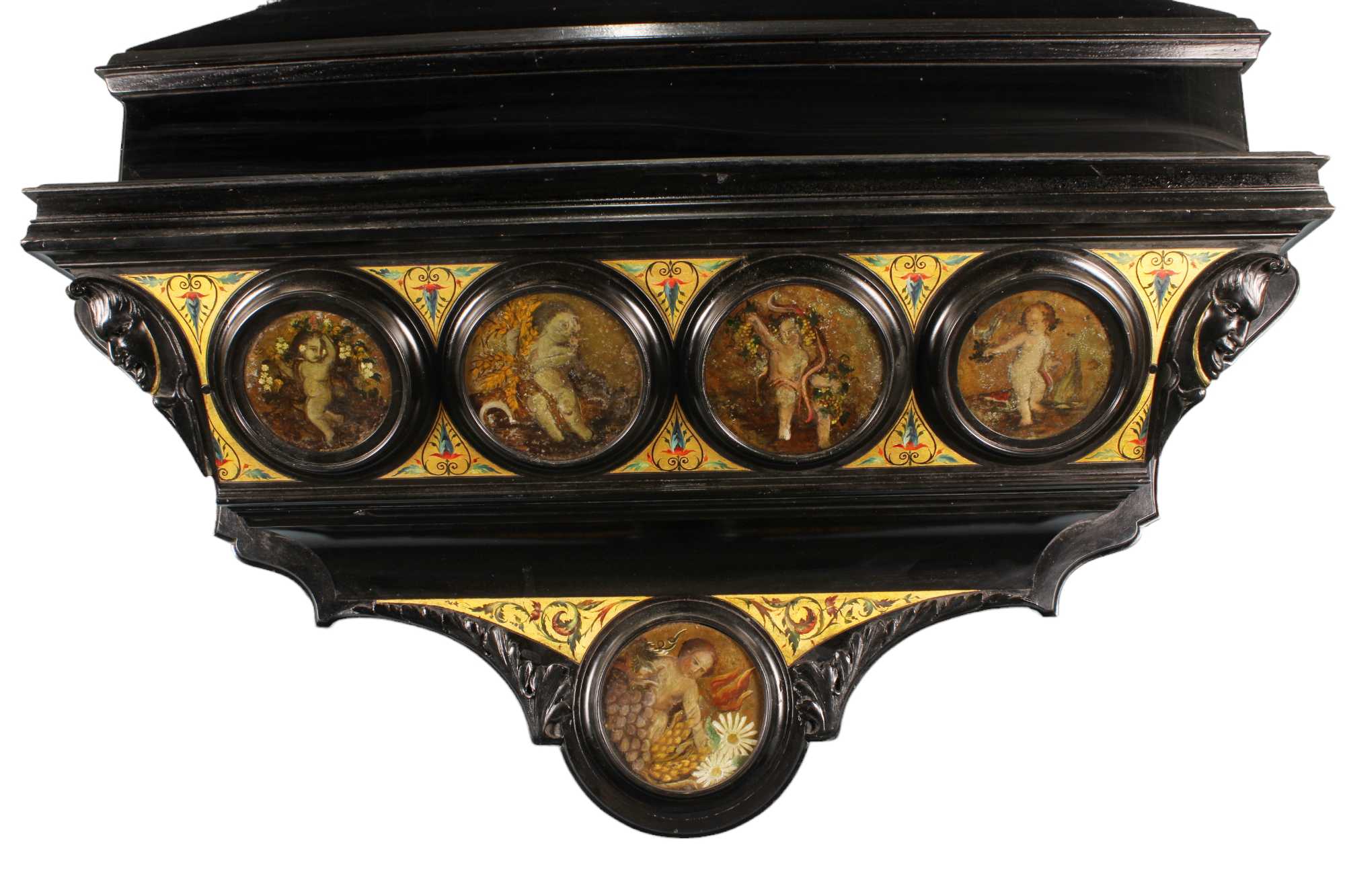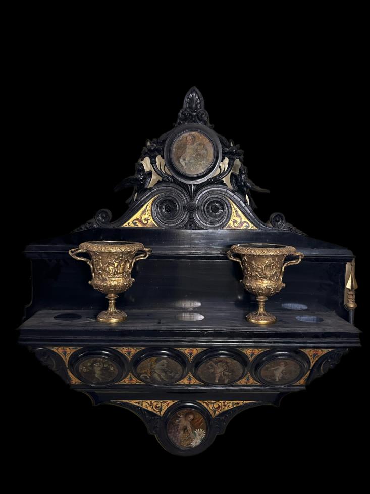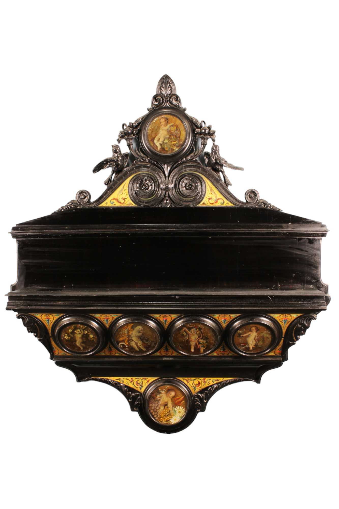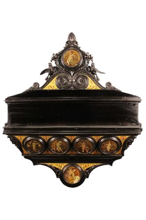 BELLA MENSOLA in legno ebanizzato, decorata da lumeggiature in oro e dipinta a motivi floreali e animali fantastici, arricchita da pitture su vetro a fondo oro a forma tonda raffigurante allegoria Sicilia XIX secolo h cm 120 x 108 x 24