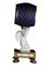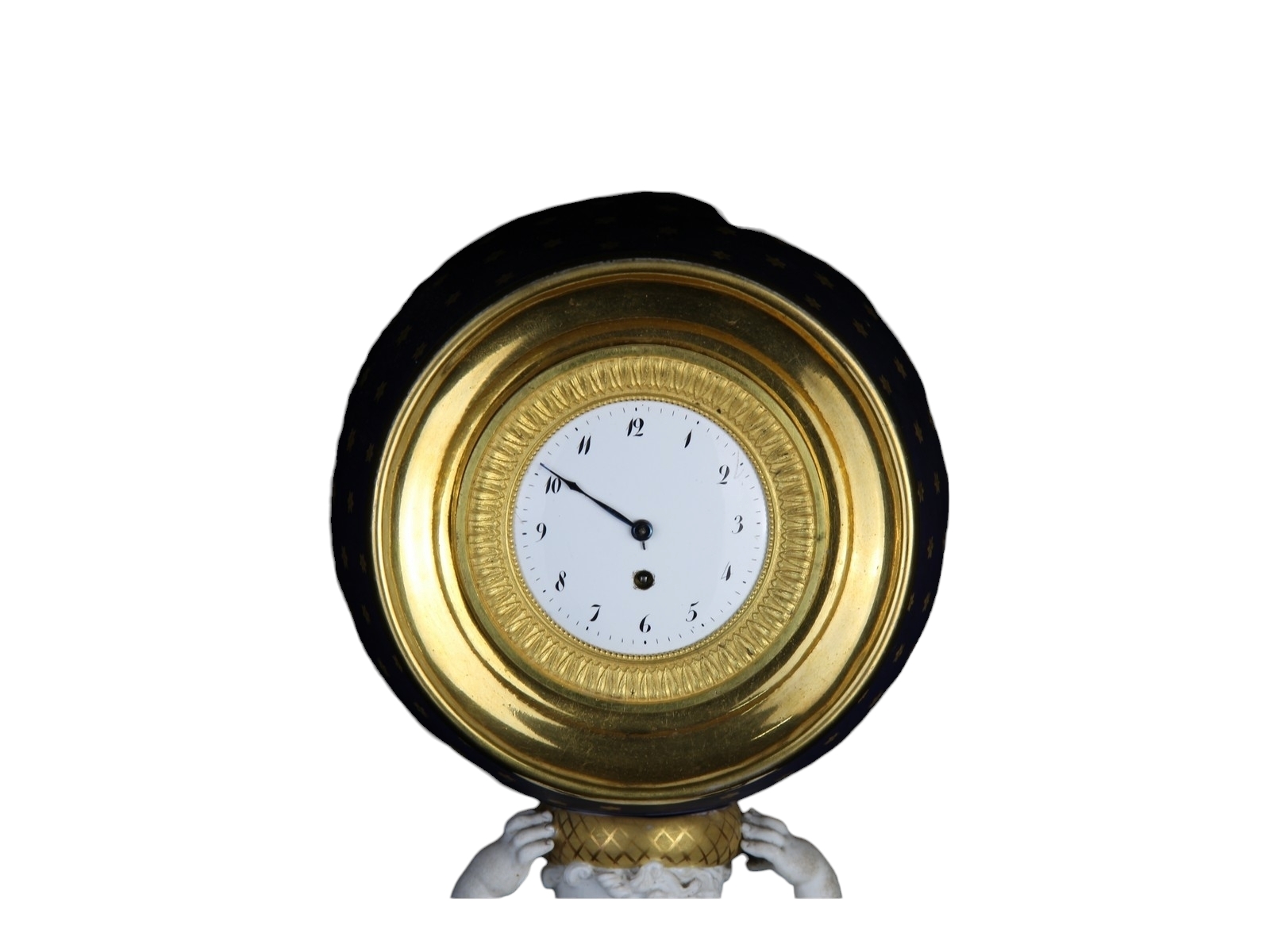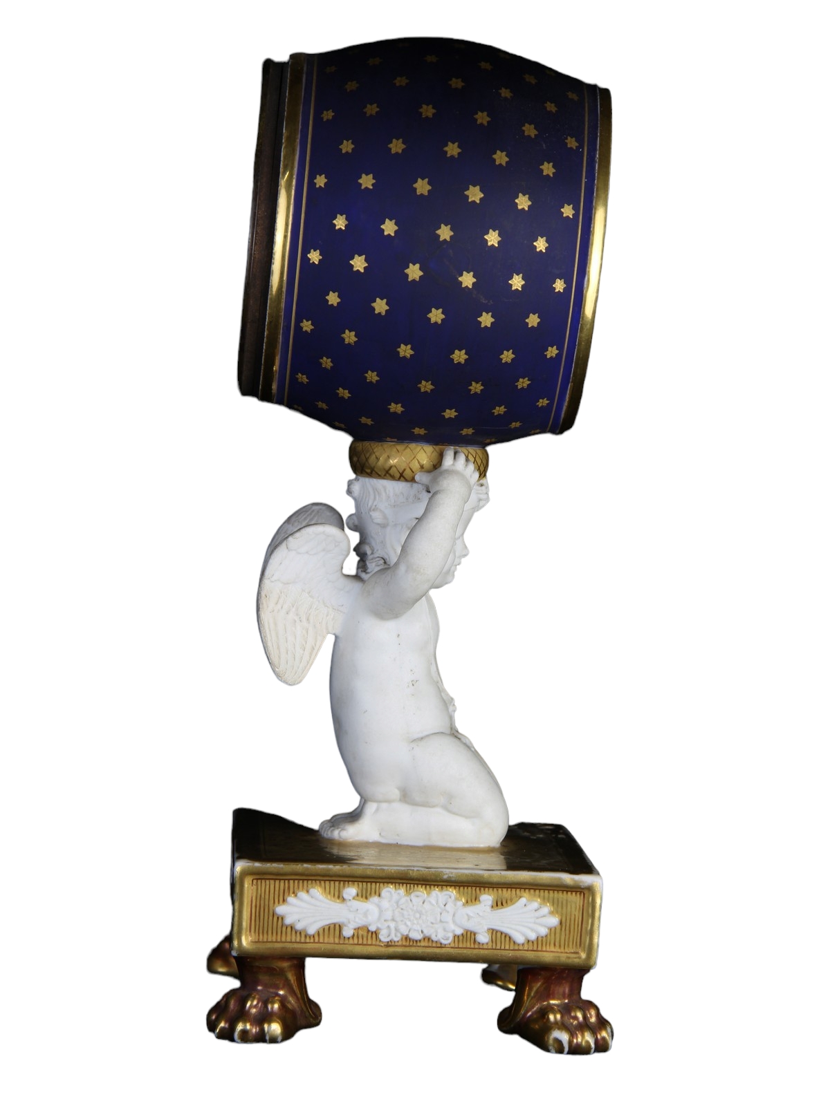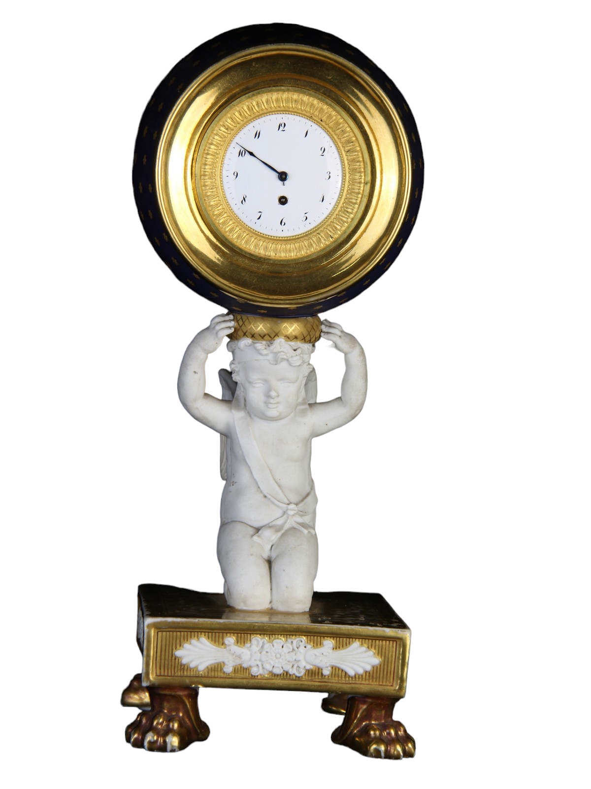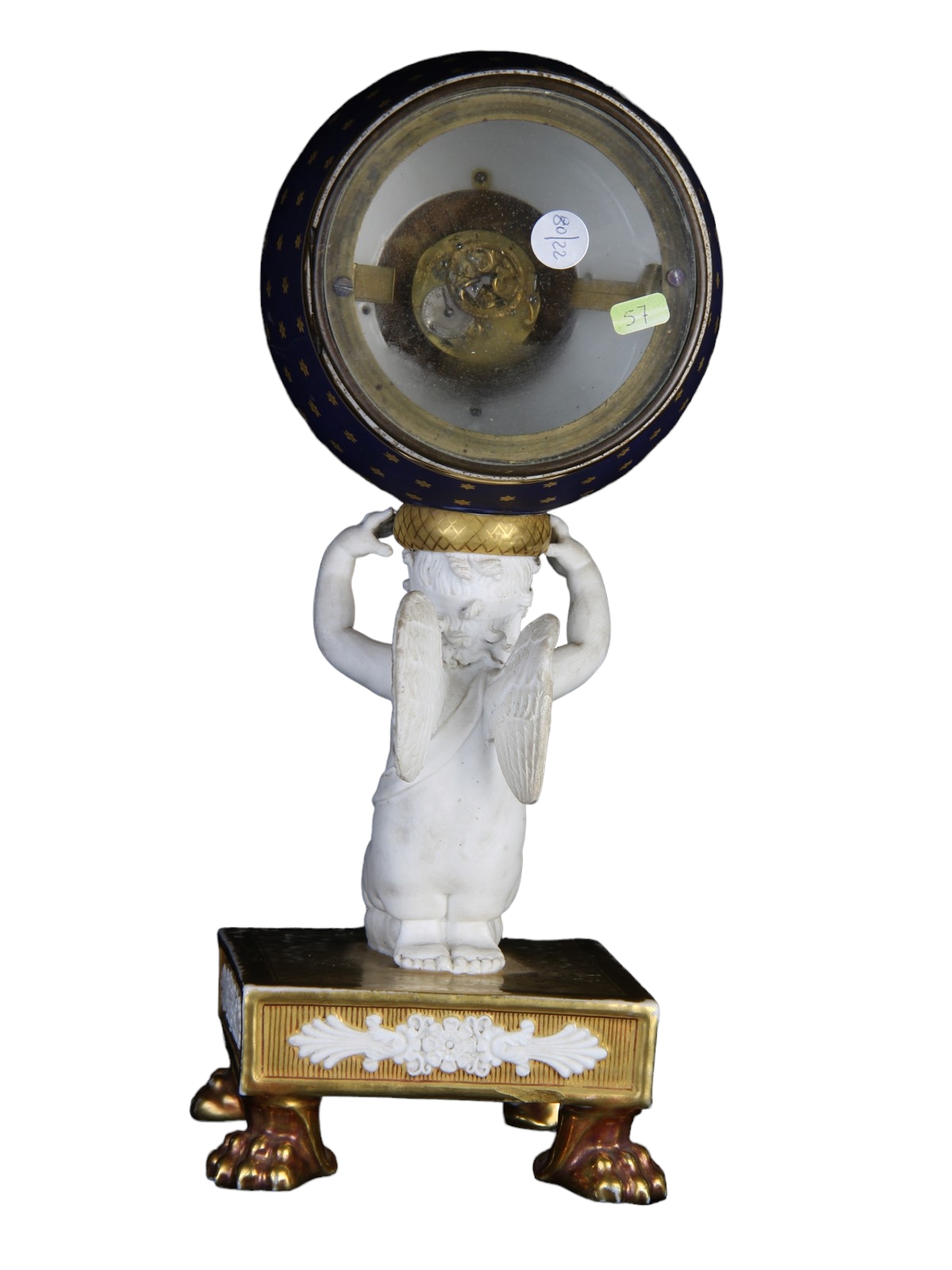 OROLOGIO in porcellana dorato e dipinto a motivi di stelle sostenuto da putto alato , base sostenuta da piedi leonini, macchina da revisionare Francia XIX secolo h cm 29 x 11,5 x 11,5