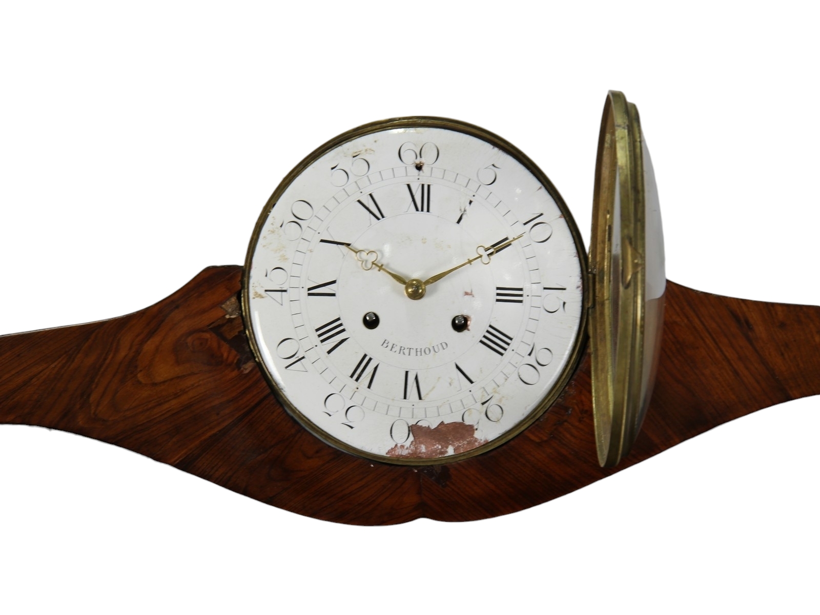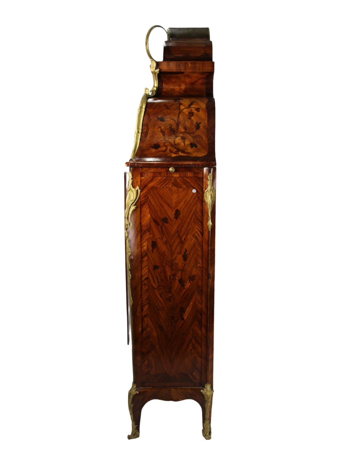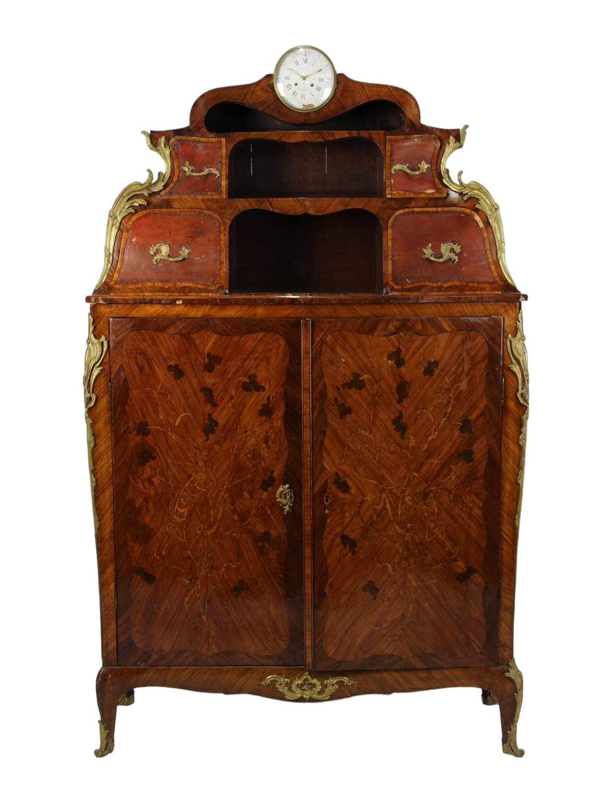 MOBILE A DUE ANTE In bois de rose ed ebano con tarsie in diverse essenze, la parte superiore a cuspide reca 4 cassetti con applicazioni in pelle , sulla cimasa orologio con quadrante in smalto bianco ed impressi numeri romani ed Arabi (mancanze dello smalto in alcuni punti), maniglie e decorazioni in bronzo cesellato. Francia XVIII/XIX SEC. h cm 186 x 114 x 38