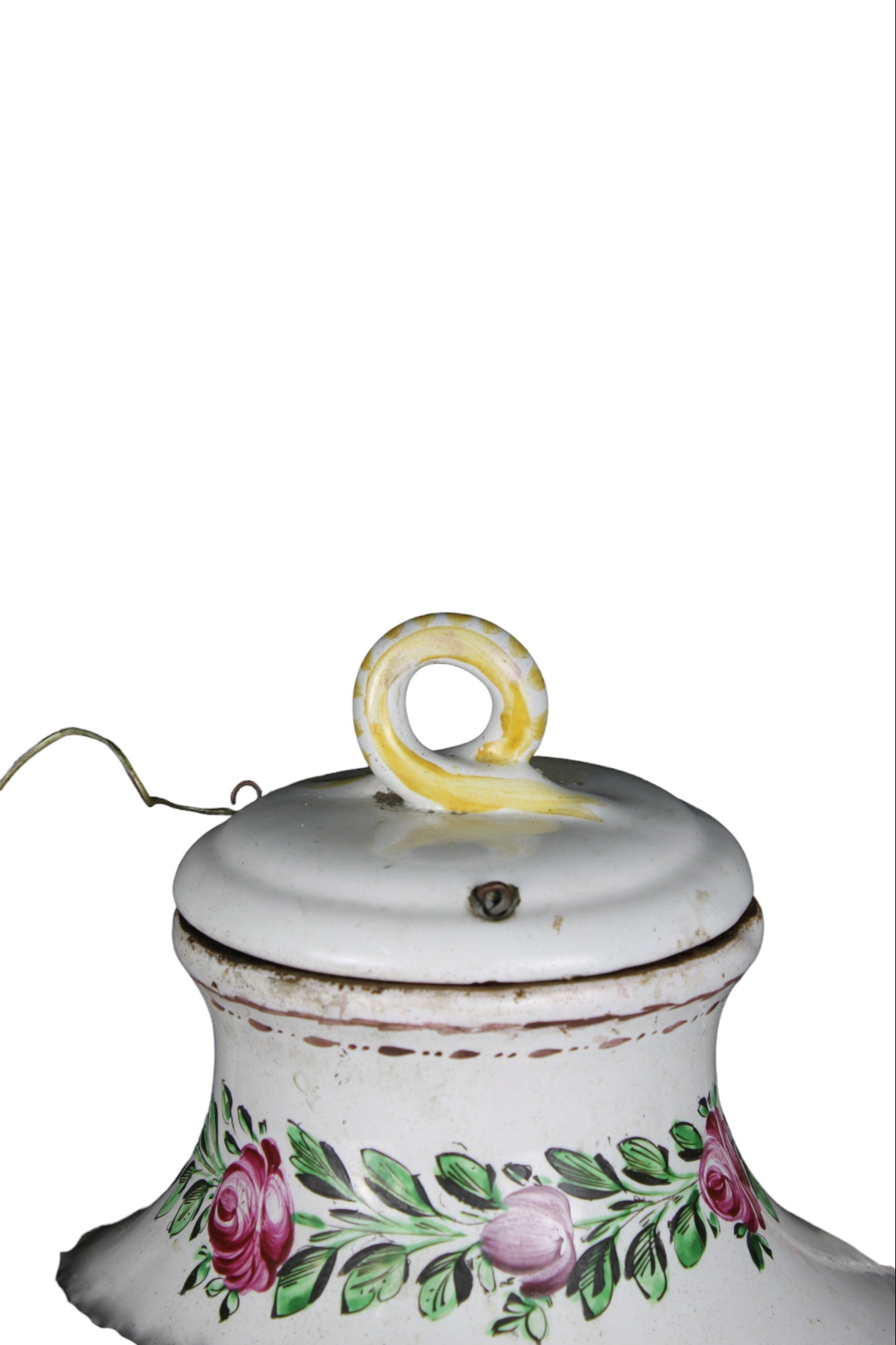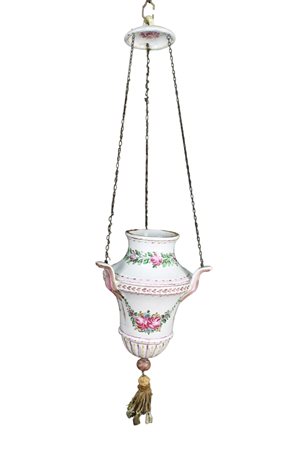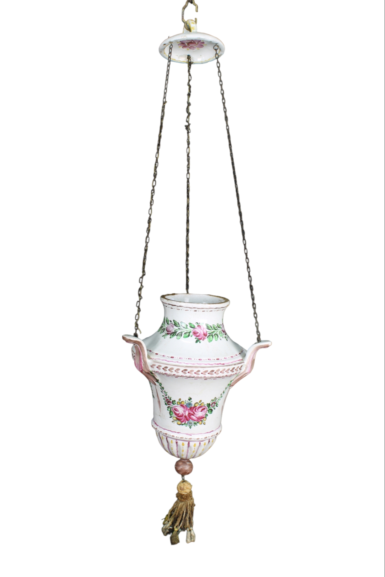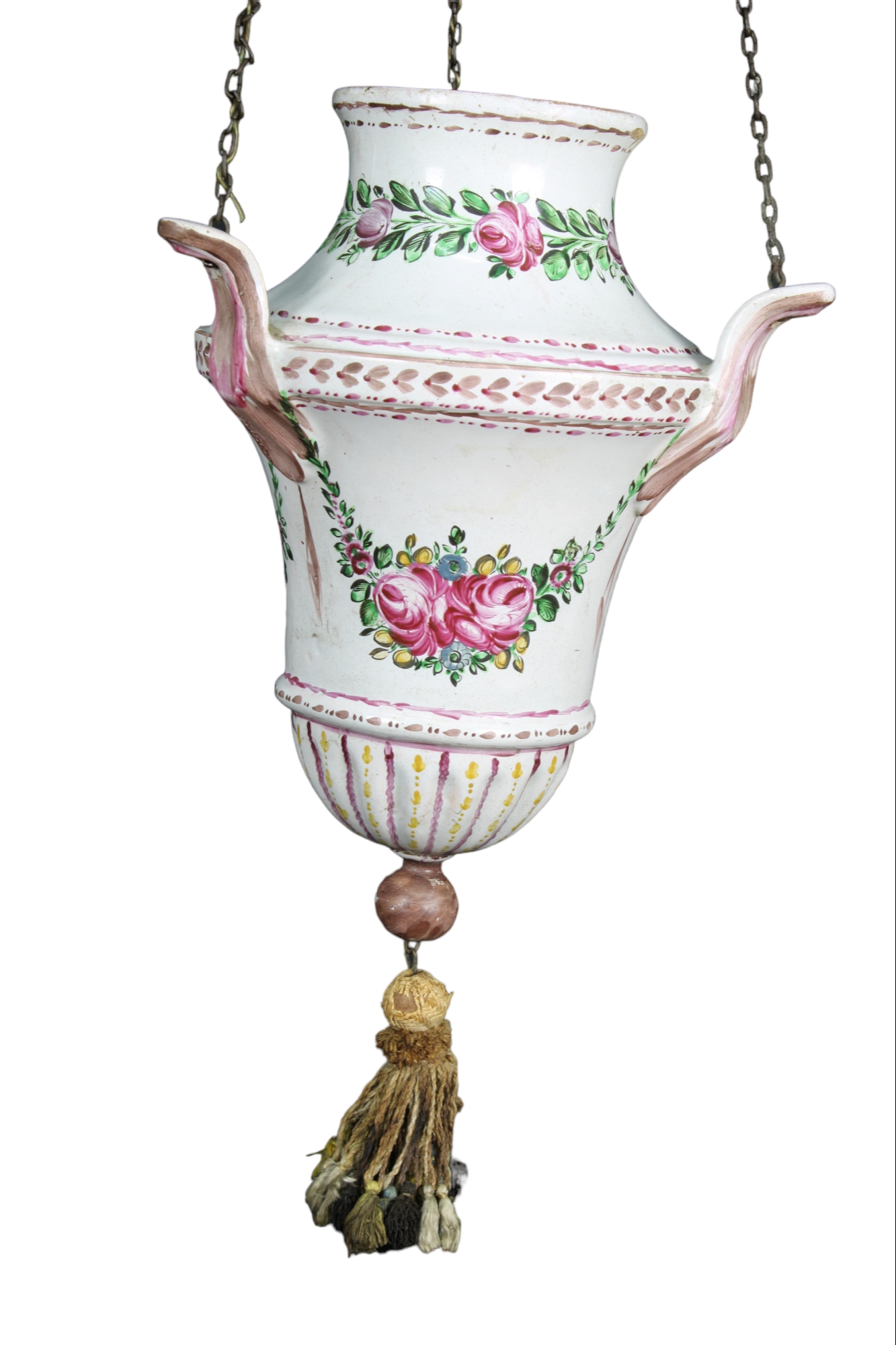 CURIOSA LAMPADA in maiolica policroma dipinta a motivi floreali manifattura Pesaro XVIII secolo h cm 80 x 25