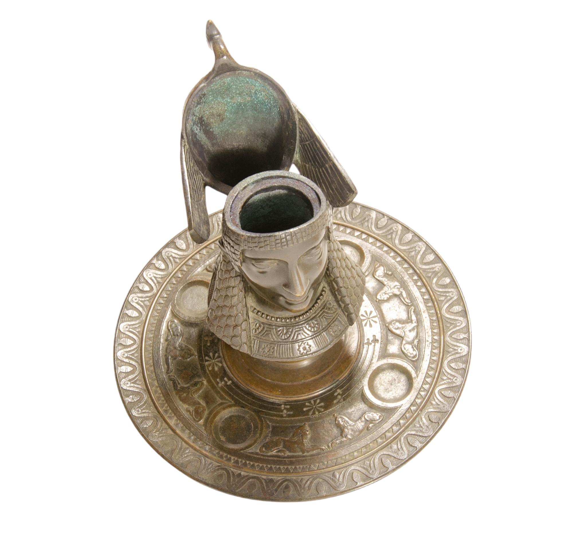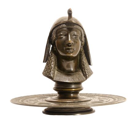 BRUCIAPROFUMO DA TAVOLO realizzato in bronzo brunito e finemente cesellato raffigurante figura egizia Francia XIX secolo h cm 18 x 20