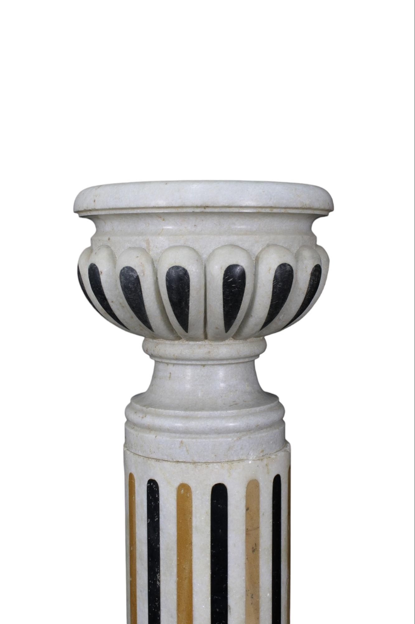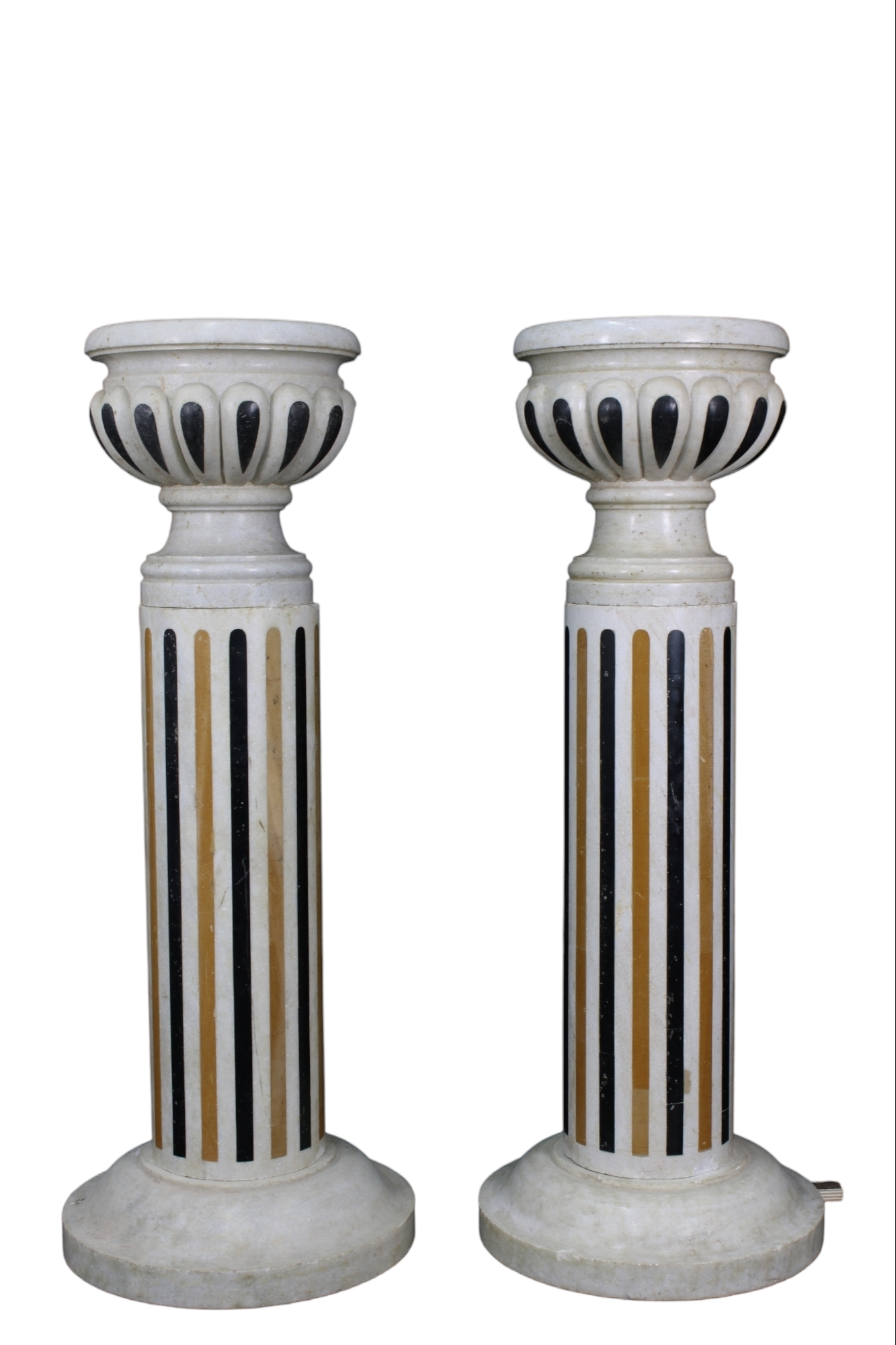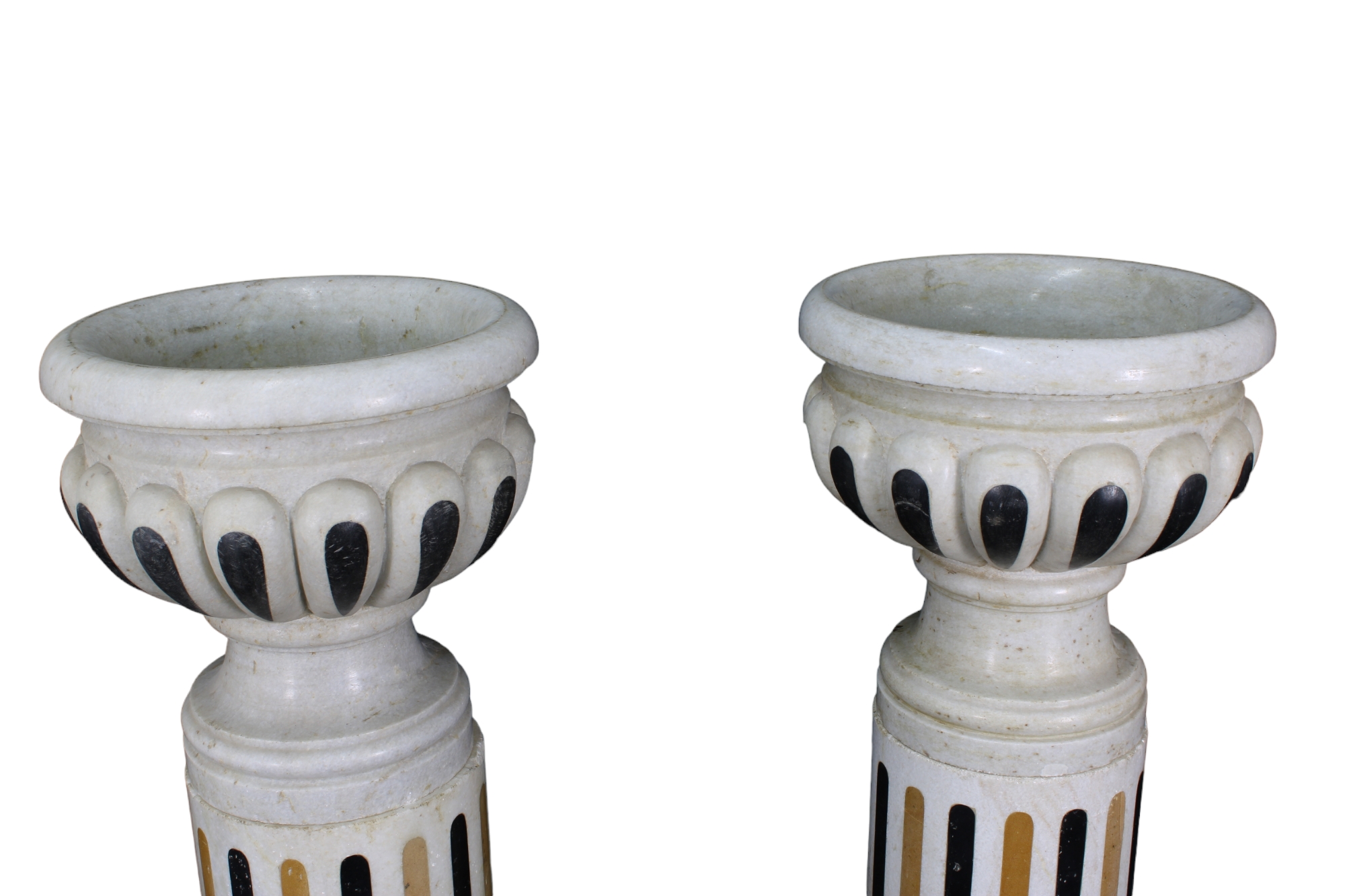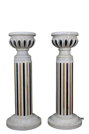COPPIA DI VASI CON COLONNE in marmo bianco intarsiate con marmo giallo e nero maestranze siciliane XIX/XX h cm 130 x 52