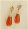 Orecchini pendenti in oro giallo con incastonati diamanti taglio brillante per 0,30 punti circa e due gocce di corallo rosso, gr. 20.