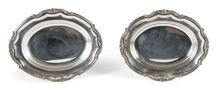 Lotto composto da due grandi centrotavola in argento, di forma ovale, battuti a mano