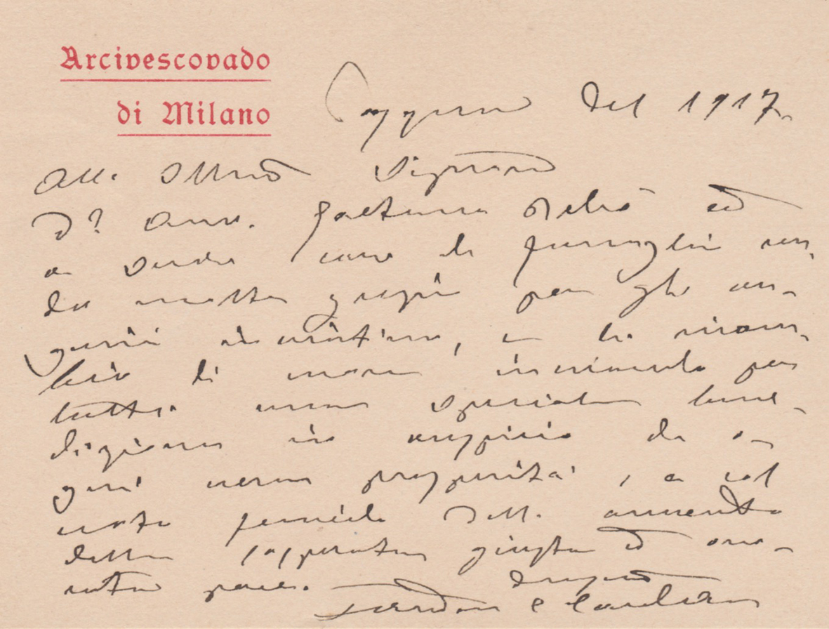 Lettera autografa firmata, datata Pasqua del 1917 dell'illustre prelato, arcivescovo di Milano dal 1894 al 1921, creato Cardinale da Leone XIII nel 1894, in risposta agli auguri ricevuti dall'avvocato Gaetano Deho. Definito dai contemporanei come ottimo pastore e teologo, venne in seguito accusato di modernismo: ciò lo portò in contrasto con papa Pio X che egli stesso aveva inizialmente sostenuto come patriarca di Venezia. Le relazioni tra i due si ammorbidirono infine nel 1912, ma monsignor Ferrari riuscì a recuperare solo con l'elezione di Benedetto XV al soglio di Pietro. La causa per la sua canonizzazione si aprì nel 1963, al termine della quale ottenne il titolo di Servo di Dio. Proclamato venerabile nel 1975 da Paolo VI (uno dei suoi successori alla cattedra episcopale milanese), venne proclamato beato da papa Giovanni Paolo II nel 1987.
