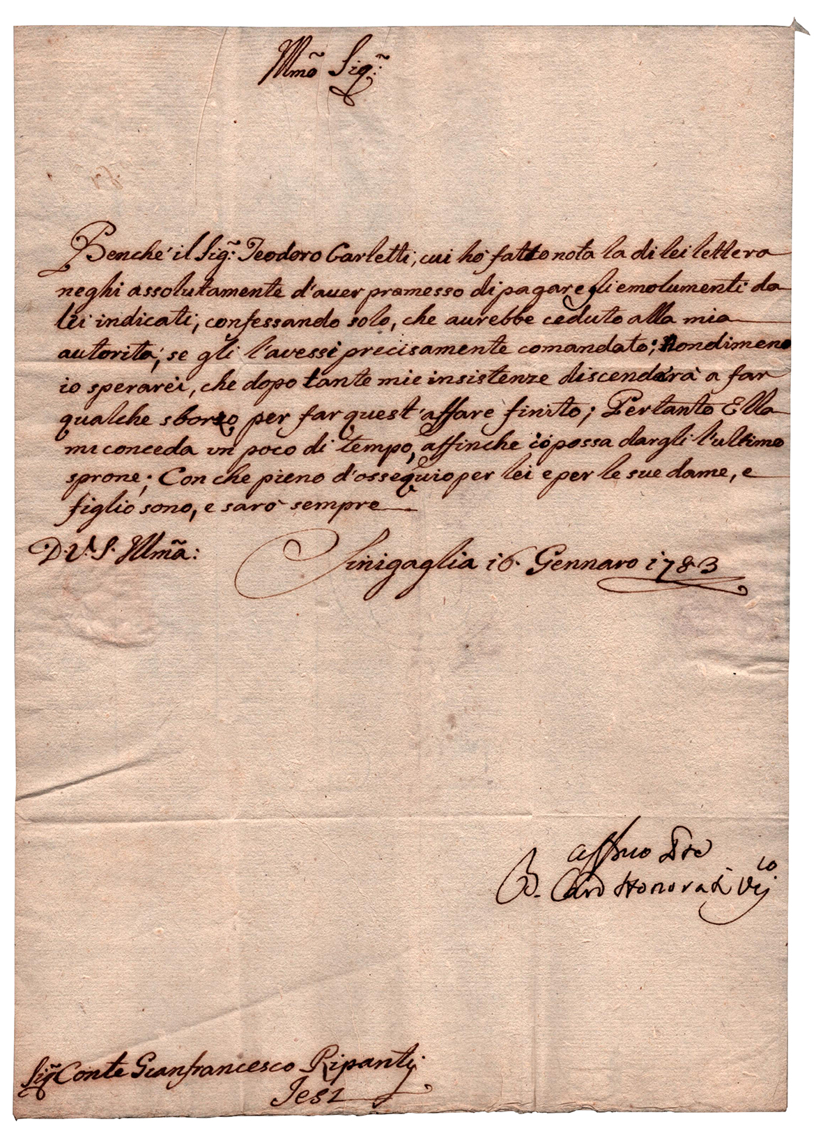 Lettera firmata datata, Sinigaglia 16 Gennaro 1783 del vescovo di Senigallia, nunzio apostolico a Firenze e Venezia, nominato Cardinale nel 1777 da Pio VI, indirizzata al Conte Gianfrancesco Ripanti di Jesi, su questioni pecuniarie. "Benché il Sig. Teodoro Carletti, cui ho fatto nota la di lei lettera neghi assolutamente d'aver promesso di pagare gli emolumenti da lei indicati, confessando solo, che avrebbe ceduto alla mia autorità, se gli l'avessi precisamente comandato; nondimeno io spererei, che dopo tante insistenze discenderà a fare qualche sforzo per far quest'affare finito; pertanto Ella me conceda un poco di tempo, affinché io possa dargli l'ultimo sprone...". Una pagina in-4, indirizzo manoscritto e traccia di sigillo alla quarta.