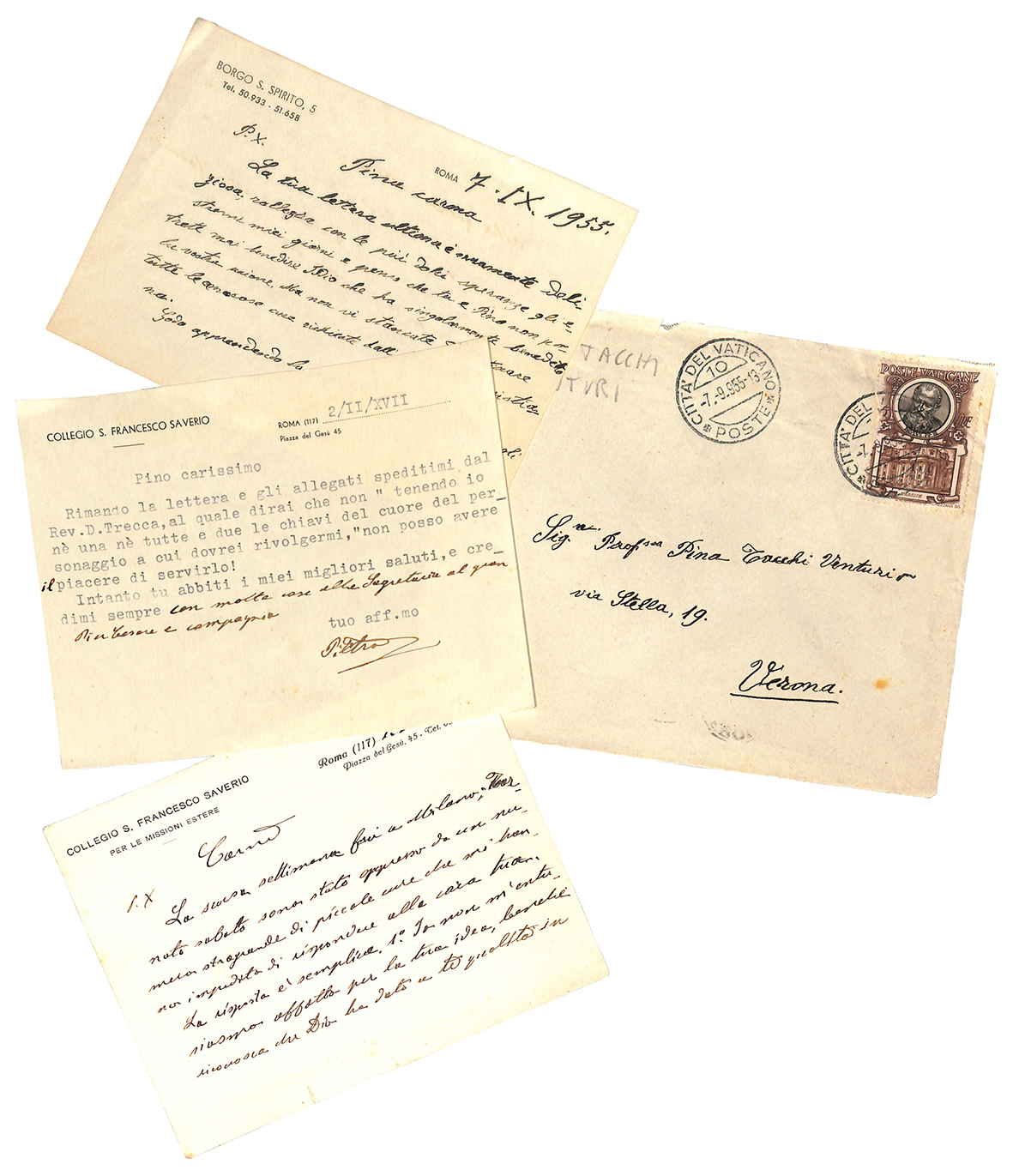 Tre lettere firmate (due integralmente autografe, la terza dattata con poscritto autografo) - (comprese tra il 1934 e il 1955) di uno dei più eminenti gesuiti del tempo - già grande tessitore della 'conciliazione' fra Papato e Italia fascista - e autorevole intellettuale cattolico Pietro Tacchi Venturi. Dopo aver terminato gli studi al Liceo Sant'Apollinare di Roma, entrò nella Compagnia di Gesù il 12 novembre 1878, cominciando il suo noviziato in Francia a Cossé-le-Vivien. Nel 1887 si iscrisse alla Sapienza, dove si laureò in lettere nel 1891. Il 28 luglio 1892 fu ordinato presbitero. Si guadagnò una reputazione come studioso di storia e di letteratura: i suoi articoli apparvero sulla "Civiltà Cattolica". Importante lavoro di Tacchi Venturi fu la pubblicazione di scritti inediti di Matteo Ricci, il missionario gesuita in Cina: le "Opere storiche del P. Matteo Ricci, S.J." furono stampate in due volumi nel 1911 e nel 1913 e contengono l'epistolario di Ricci e i suoi "Commentari della Cina". Tacchi Venturi divenne amico di Mussolini, prima che salisse al potere, per questa ragione divenne "lo strumento normale per i messaggi fra il papa e Mussolini". Questi rapporti con Mussolini furono ufficializzati quando papa Pio XI scelse padre Tacchi Venturi per negoziare l'acquisto dell'antica biblioteca di Palazzo Chigi dal governo fascista. La scelta di Mussolini di donarla diede l'avvio al processo di riconciliazione fra l'Italia e la Santa Sede, che era stato problematico dopo la conquista di Roma del 1870, che aveva privato il Papa del suo stato. Tacchi Venturi fu un negoziatore dei Patti Lateranensi (1929), che posero fine alla "Questione romana" e riconobbero la sovranità della Santa Sede e diedero origine allo Stato della Città del Vaticano. Il New York Times descrisse Tacchi Venturi come il "principale negoziatore, che rimane nell'ombra ed è quasi sconosciuto". Tacchi Venturi fu tenuto al corrente da Mussolini dei preparativi per le leggi razziali fasciste ed espresse riserve sull'effetto delle leggi sui cattolici, sia per i matrimoni misti sia per gli ebrei convertiti al Cattolicesimo. In particolare, Tacchi Venturi cercò di evitare il divieto di matrimoni fra "ariani" e "non ariani". Dopo che i suoi tentativi di mitigare le leggi razziali ebbero scarso frutto, padre Tacchi Venturi intervenne presso Mussolini per richiedere esenzioni per singoli casi, tanto di ebrei convertiti al cristianesimo quanto di ebrei che professavano il giudaismo. Dopo l'elezione di Pio XII nel conclave del 1939, fu annunciato che don Francesco Tomasetti, procuratore generale dei Salesiani, avrebbe sostituito Tacchi Venturi come messaggero non ufficiale fra il Papa e Mussolini. Tacchi Venturi rimase il rappresentante ufficiale presso la Direzione della Polizia e il Consiglio superiore sulla demografia e la razza. In qualche occasione si servì della sua influenza per agevolare ebrei convertiti al Cattolicesimo. Dopo la morte di Mussolini, Pietro Tacchi Venturi, ormai ottantaquattrenne, non ebbe più ruoli di rilievo e si dedicò nuovamente all'attività di storico. Le missive sono dirette ad alcuni famigliari: "La tua lettera ultima è veramente deliziosa, rallegra con le più dolci speranze gli estremi miei giorni e penso che tu e Pino non potrete mai benedire Idio che ha singolarmente benedetto la vostra unione...". Tre pagine in-16 obl. (due su carta intestata 'Collegio S. Francesco Saverio'). E' unita una busta viaggiata con indirizzo autografo.