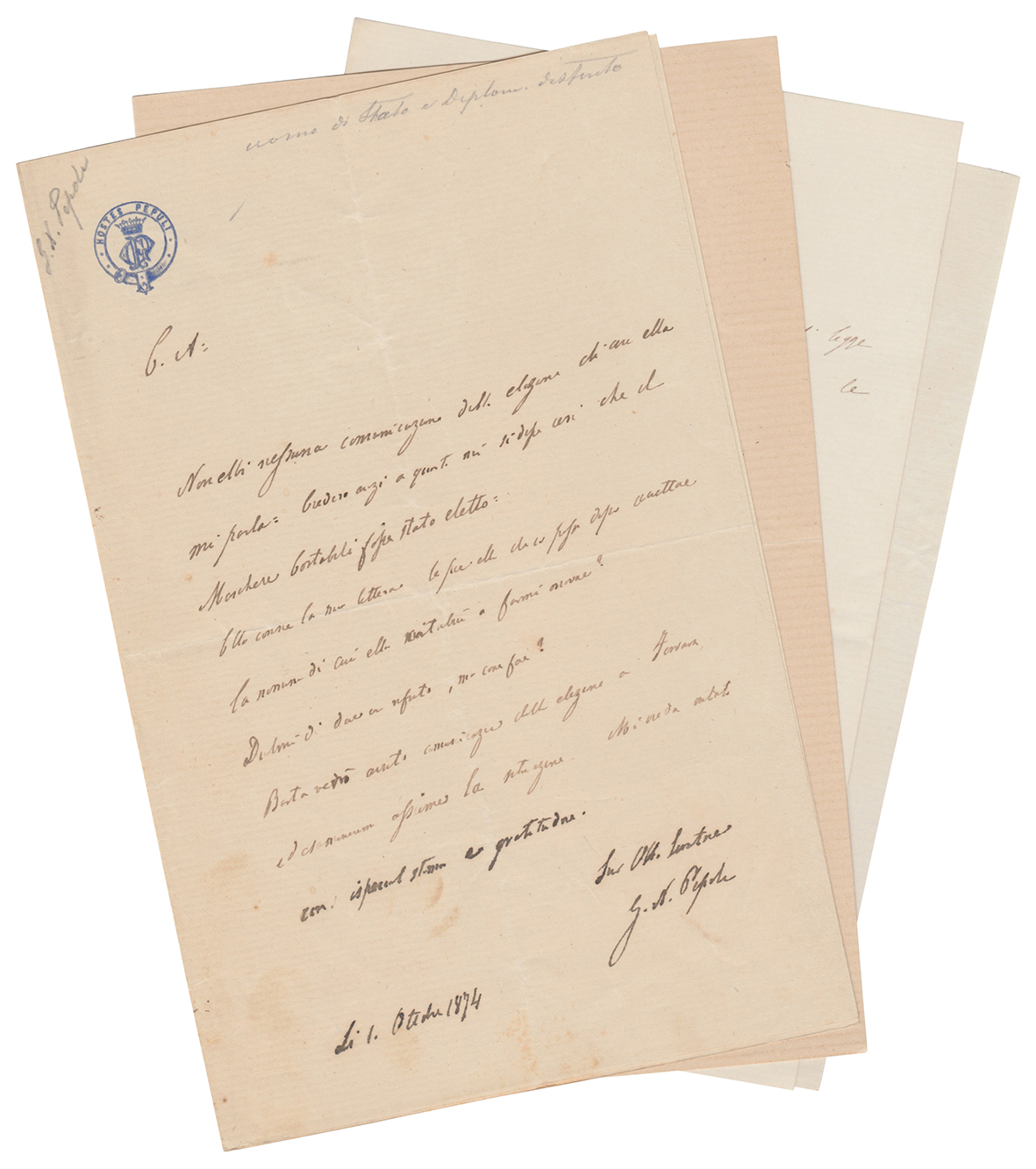 Carteggio costituito da quattro lettere autografe firmate da Gioacchino Napoleone Pepoli, politico, Senatore del Regno d'Italia e Sindaco di Bologna. Figlio del marchese Guido Taddeo Pepoli e della principessa Letizia Murat, figlia di Gioacchino Murat quindi nipote di Napoleone Bonaparte. Nel 1844 Pepoli sposò la principessa Federica Guglielmina di Hohenzollern-Sigmaringen, figlia di Carlo di Hohenzollern-Sigmaringen e cugina di Federico Guglielmo IV di Prussia. Attivo nelle rivolte del 1848, fu comandante della Guarda Civica di Bologna e contrastò l'occupazione austriaca della città. In esilio in Toscana dal 1849 al 1852, partecipò all'insurrezione nella Legazione delle Romagne del 1859 che portò all'annessione della regione al Regno d'Italia.