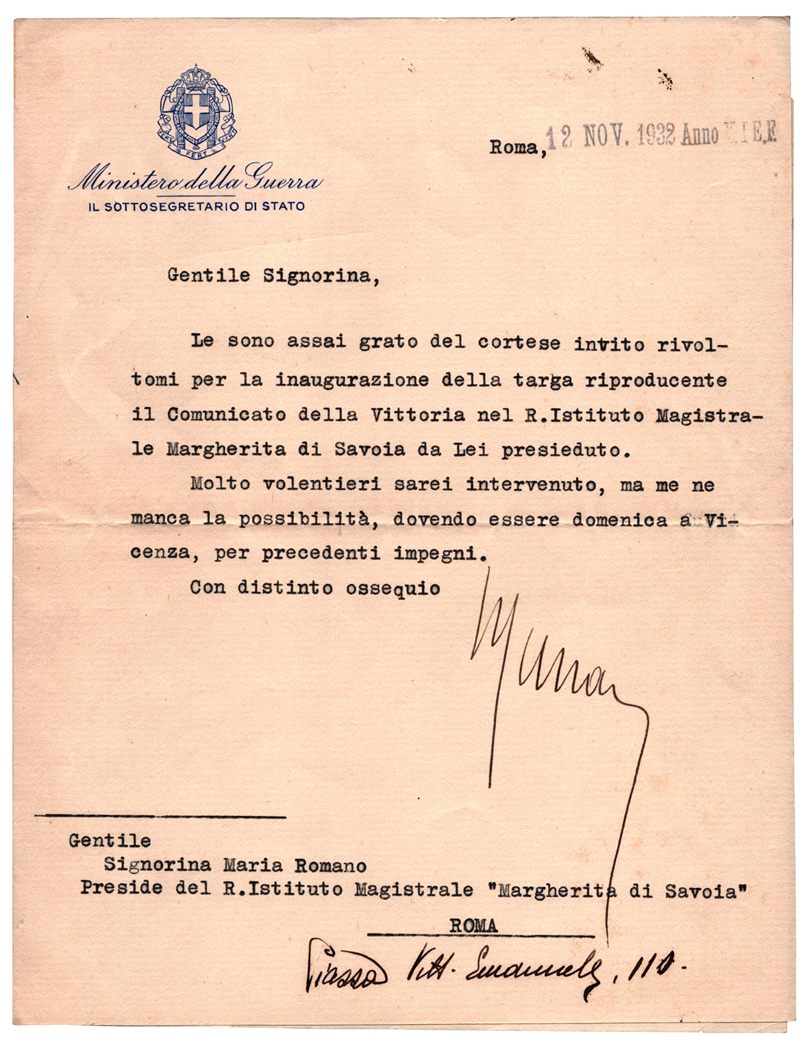 Lettera dattiloscritta firmata, Roma, 12 Nov. 1932 dell'ufficiale del Regio Esercito Italiano (Comandante del X Battaglione Alpini) e uomo politico (podestà e sottosegretario del Ministero della Guerra) diretta a Maria Romano, preside del R. Istituto Magistrale 'Margherita di Savoia'. Declina cortesemente un invito. "Le sono assai grato del cortese invito rivoltomi per la inaugurazione della targa riproducente il Comunicato della Vittoria nel R. Istituto Magistrale Margherita di Savoia da Lei presieduto. Molto volentieri sarei intervenuto, ma me ne manca la possibilità…". Una pagina in-8, carta intestata 'Ministero della Guerra - Il sottosegretario di Stato'.