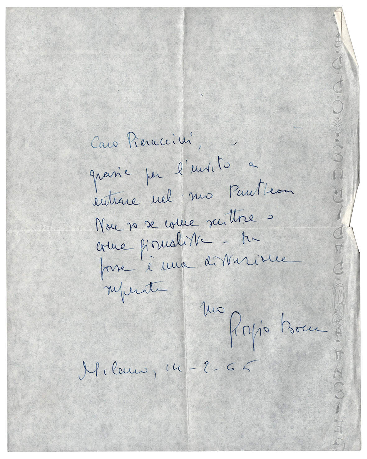 La missiva diretta al giornalista Giovanni Pieraccini: "Grazie per l’invito a entrare nel suo Pantheon. Non so se come scrittore o come giornalista. Ma forse è una distinzione superata...". Una pagina in-8, inchiostro blu. Acclusa busta con indirizzo autografo.