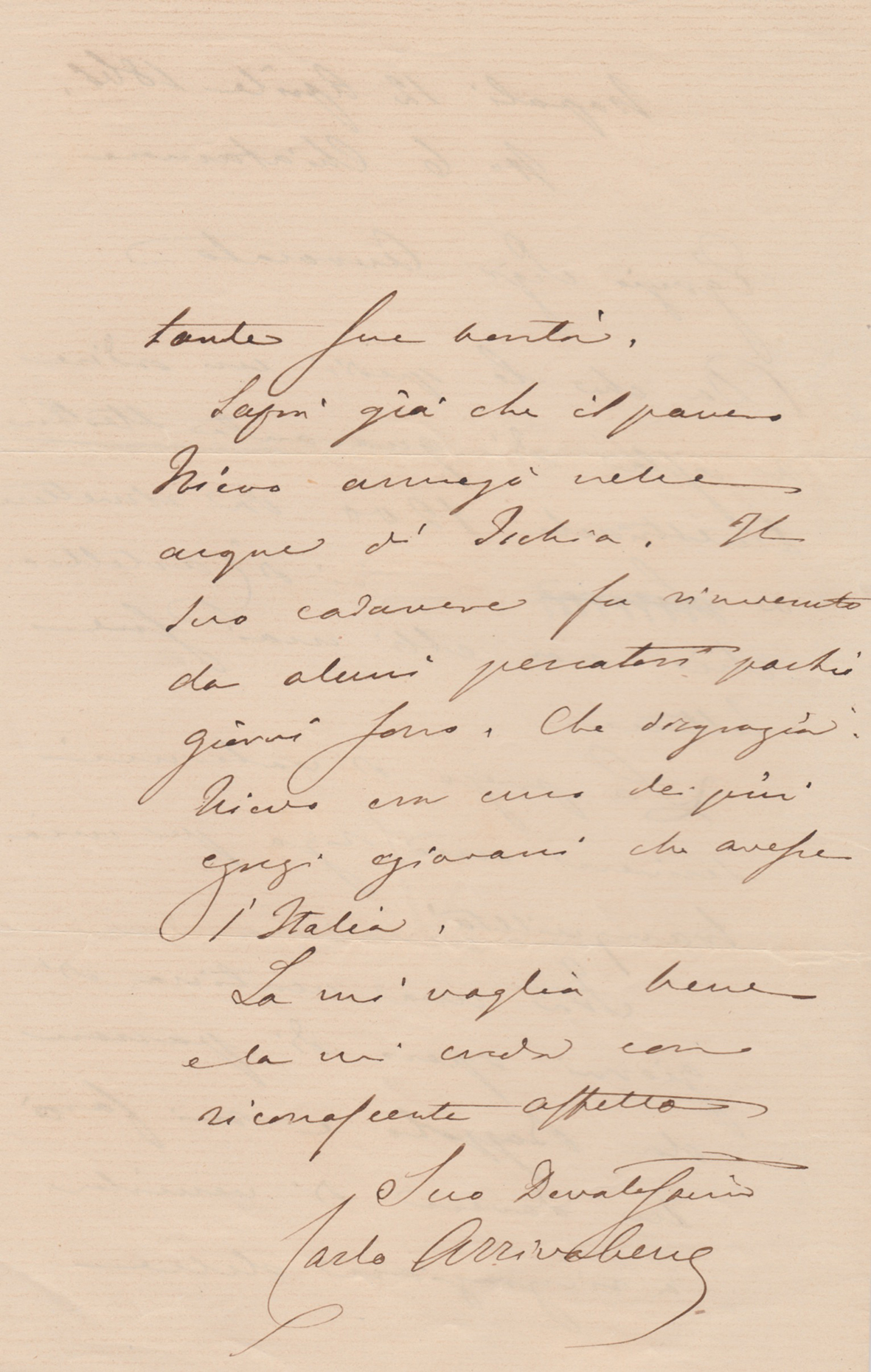 Lettera autografa firmata, datata Napoli 12 Aprile 1861 del patriota, uomo politico e giornalista, professore di lingua e letteratura italiana all'università di Londra (1854-55) e collaboratore di diversi giornali britannici, diretta ad un "Egregio Signor Avvocato", nella quale esprime il proprio dolore per la morte del rinomato scrittore e patriota garibaldino Ippolito Nievo. "Saprà già che il povero Nievo annegò nelle acque di Ischia. Il suo cadavere fu rinvenuto da alcuni pescatori pochi giorni sono. Che disgrazia. Nino era uno dei più egregi giovani che avesse l'Italia...". Due pagine in-8, su bifolio.