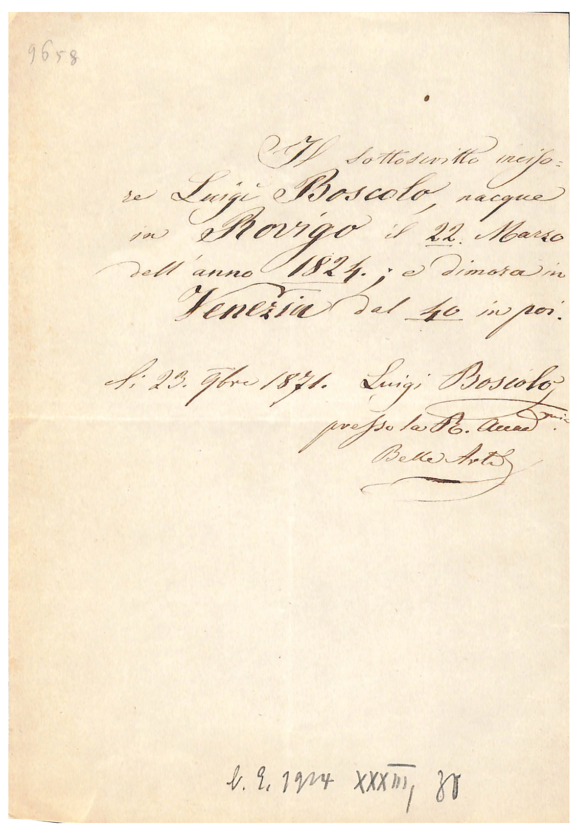 Pagina di liber amicorum (in-8) con righi di testo autografi firmati e datati 'li 23 9bre 1871' del pittore e incisore, professore all'Accademia di Belle Arti di Venezia. Breve nota autobiografica. E' presente una data a matita di altra mano '1. 9. 1914'.