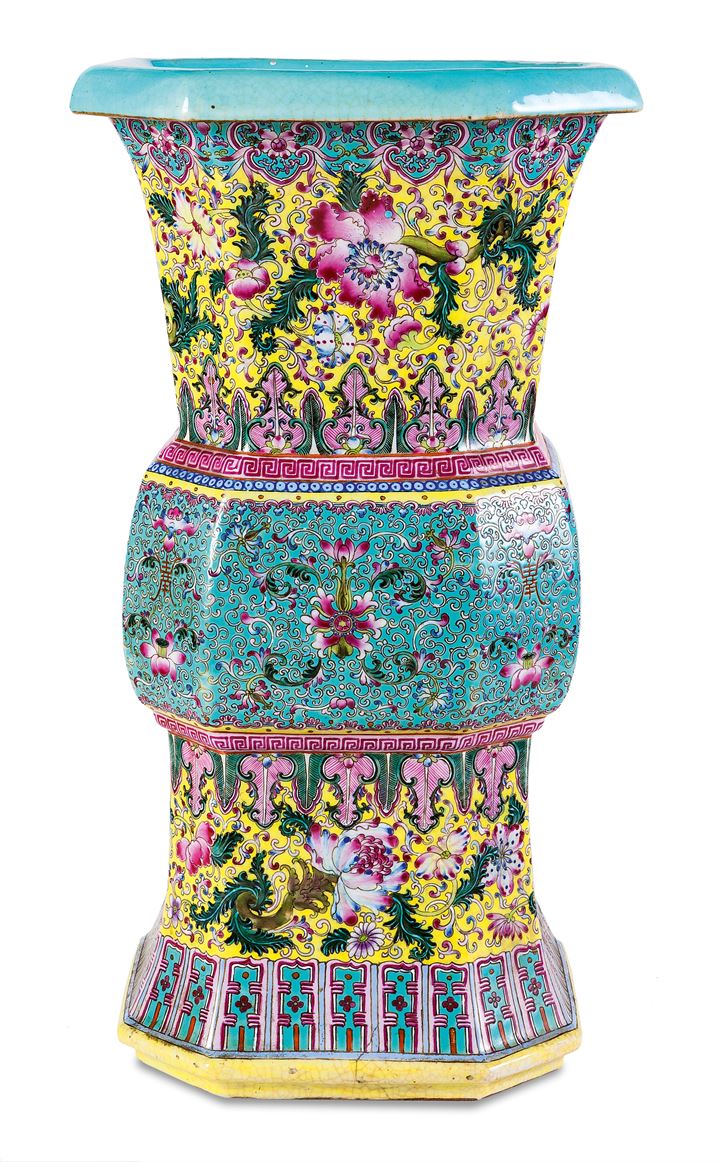 Vaso in porcellana di Cina, XIX secolo, di forma ottagonale, finemente decorato in policromia e smaltato con motivi floreali