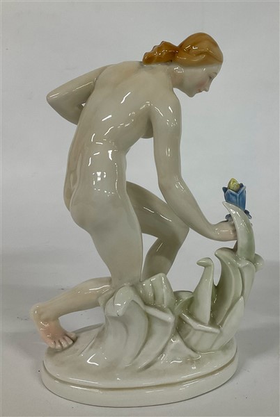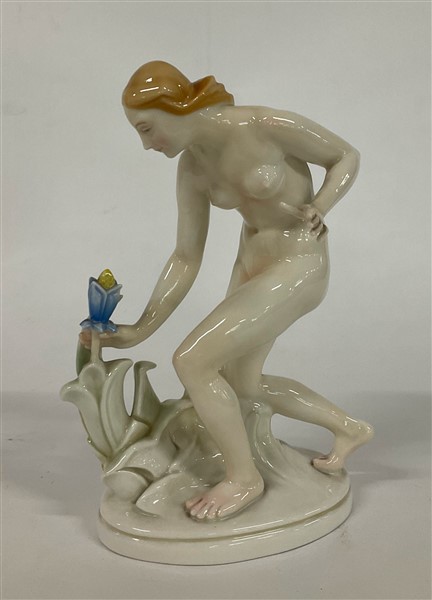 Scultura in porcellana dipinta in policromia raffigurante fanciulla che coglie un fiore. Germania, anni '30. Marchio della manifattura sotto la base. (h cm 27) (difetti)