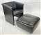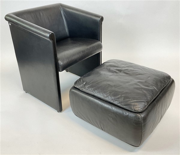Poltrona a pozzetto con pouf in pelle nera. Italia, anni '70. (poltrona cm 60x72x56; pouf cm 56x32x56) (lievi difetti)