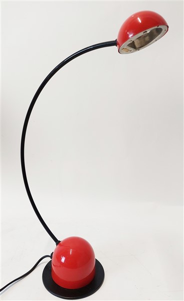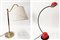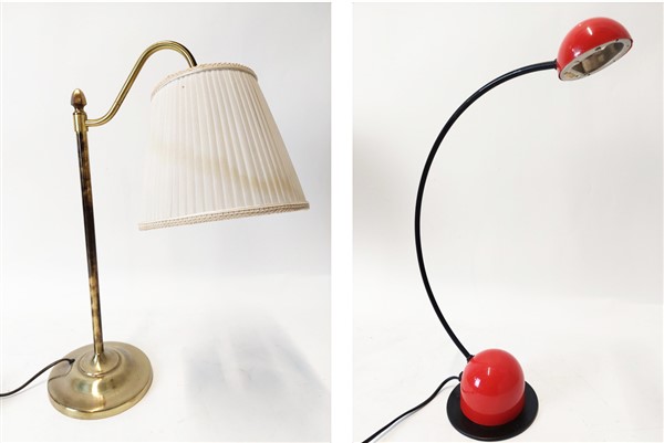 Lotto composto da una lampada da tavolo in ottone con paralume in stoffa plissée. Italia, anni '70. E una lampada da tavolo alogena rossa. Produzione Nuova Veneta Lumi. (h max cm 52) (lievi difetti)