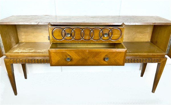 Contro-buffet impiallacciato e intagliato a due cassetti entro due ante, gambe rastremate. Italia, anni '40/'50. (cm 200x100x50) (difetti)