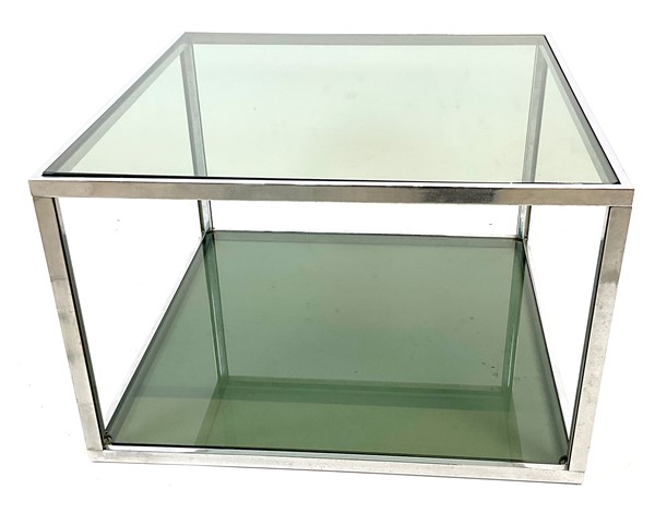 Tavolino in acciaio con piani in cristallo fumé. Italia, anni '70. (cm 55x35,5x55) (lievi difetti)