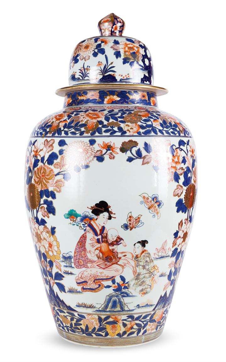 Grande potiche in porcellana, Cina XX secolo, decoro Imari con fiori e personaggi