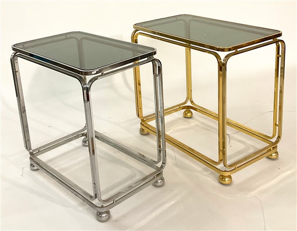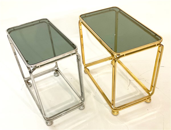 Lotto di due carrelli portavivande in metallo cromato e ottonato, piani in vetro fumè. Italia, anni '70. (cm 78x73x44 e 70x72x42) (difetti, mancanti dei piani in vetro inferiori)