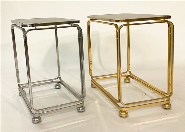 Lotto di due carrelli portavivande in metallo cromato e ottonato, piani in vetr