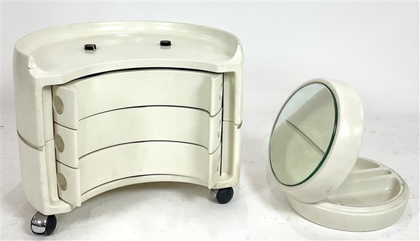 Lotto composto da un mobile da toilette in materiale plastico bianco con rotelle a tre cassetti girevoli (cm 51x39x43) con trousse en suite di forma circolare con specchio (d cm 29, h cm 13). Italia, anni '70. (difetti e mancanze)