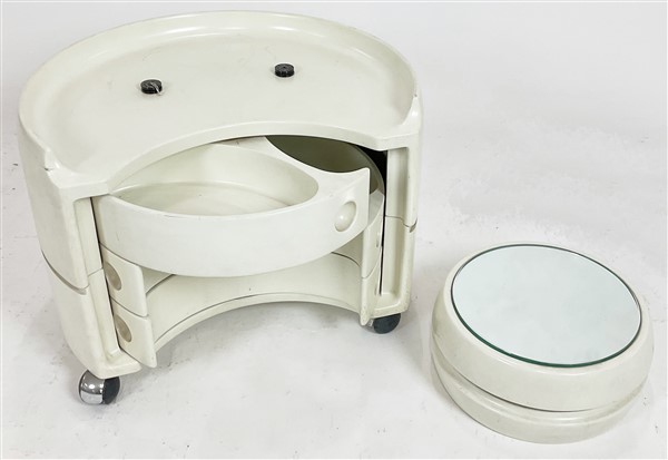 Lotto composto da un mobile da toilette in materiale plastico bianco con rotelle a tre cassetti girevoli (cm 51x39x43) con trousse en suite di forma circolare con specchio (h cm 13; d cm 29). Italia, anni '70. (difetti e mancanze)