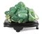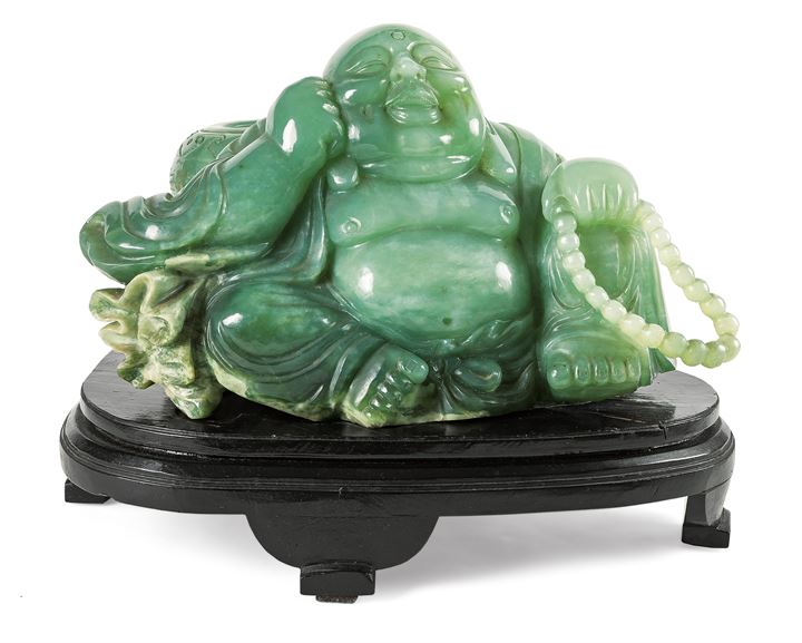 Grande scultura in giadeite verde, raffigurante Budda seduto che trattene in una mano un rosario buddista; alle spalle una giara