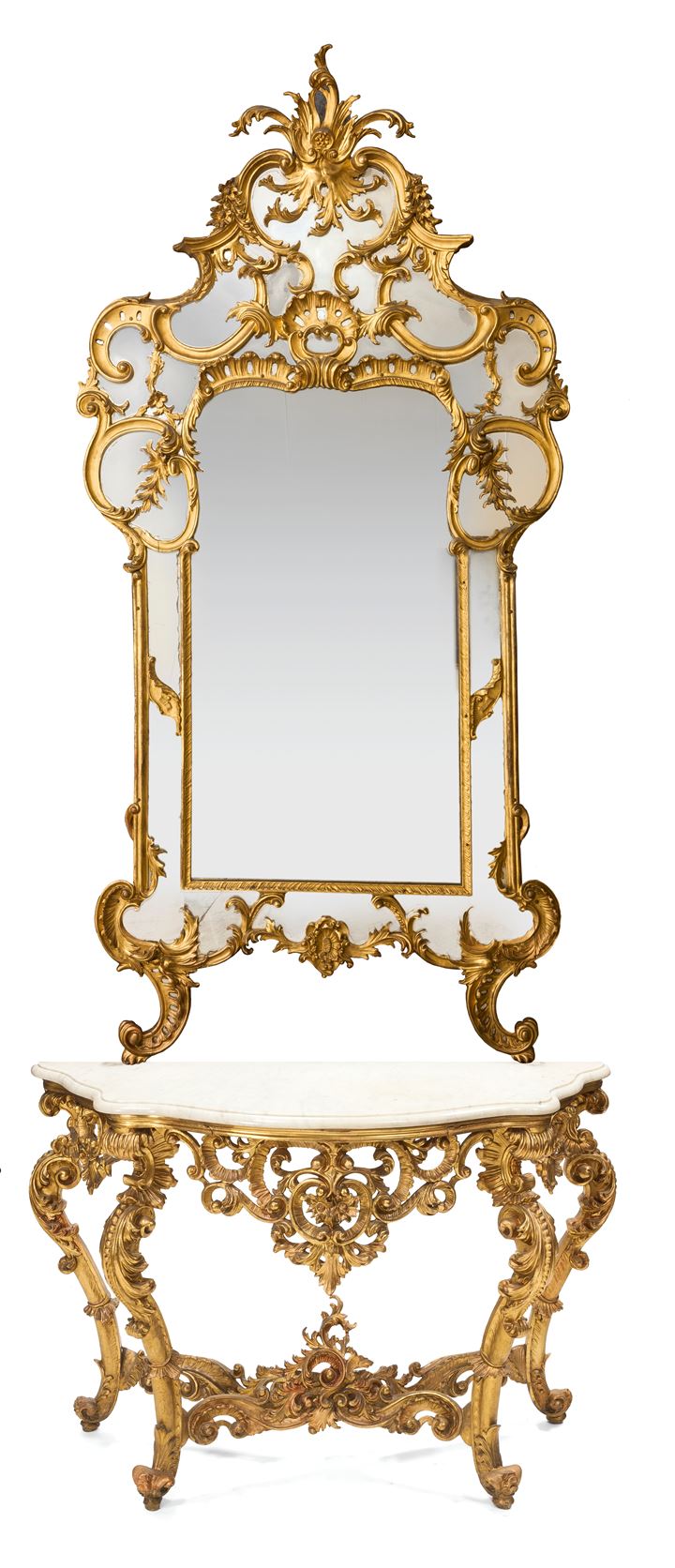 Console con grande specchiera a doppio ordine di specchi; in legno dorato e scolpito a volute vegetali e floreali; gambe mosse raccordate da traversa; piano sagomato in marmo bianco; fine XIX secolo
