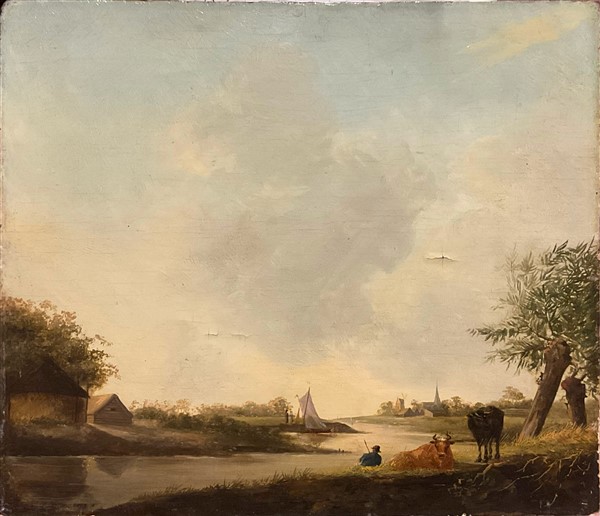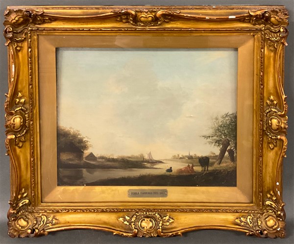 Lotto 402 | Scuola olandese del secolo XVIII "Paesaggio con pastore e armenti" Olio su tav