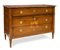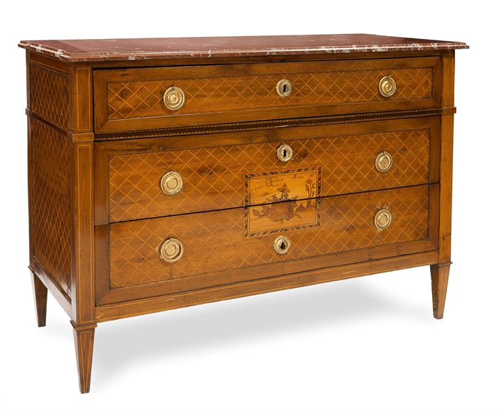 Cassettone, epoca Luigi XVI, fine XVIII, a tre tiretti in noce filettato con intarsio a scena galante, piano sagomato in marmo rosa