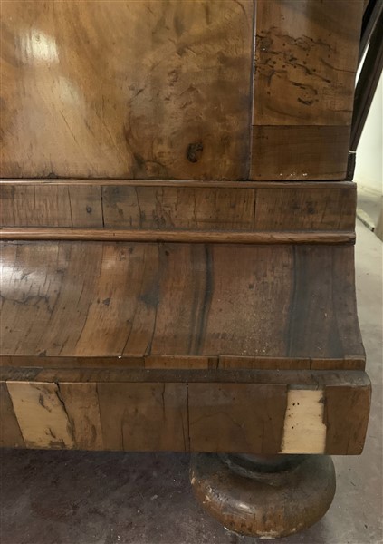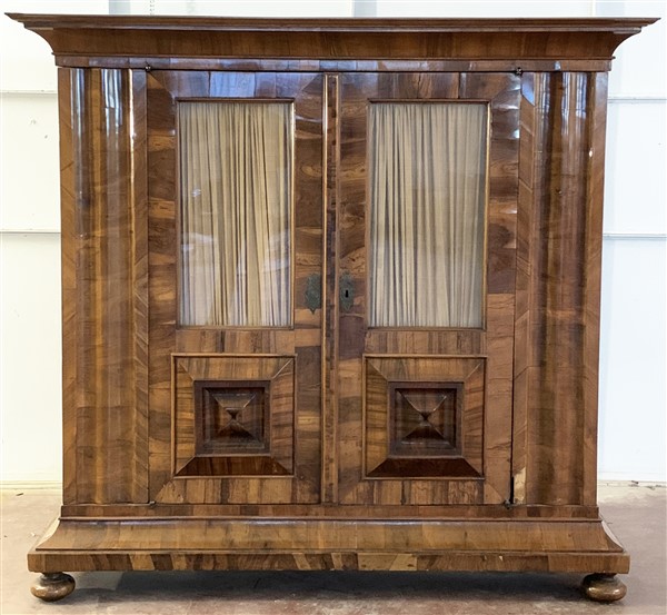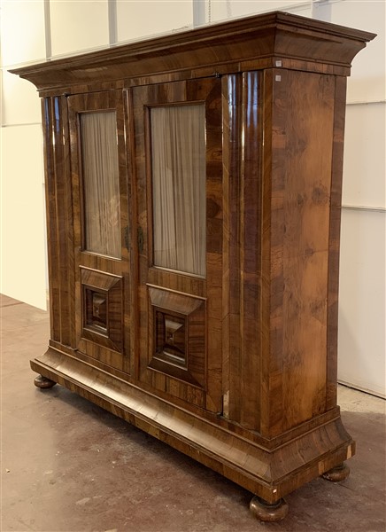 Armadio a due ante lastronato in radica di noce, ante in parte pannellate a motivo geometrico e in parte a vetrina, piedi a cipolla. Secolo XIX (L cm 195) (difetti)