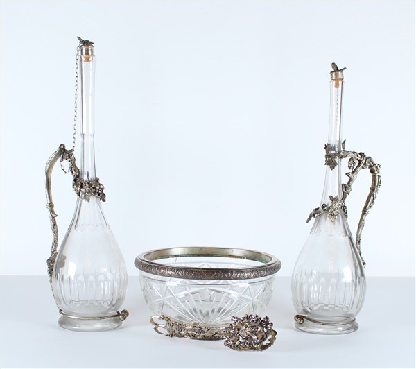Lotto composto da due bottiglie in vetro con ghiere, tappi e prese in metallo argentato decorate a tralci di vite e uva (h. max cm 46), una fruttiera con bordo a motivi fioriti (h. cm 11,5; d. cm 23, 5 ca.) e una paletta traforata decorata a mascheroni a rilievo e incisi e motivi vegetali (difetti)
