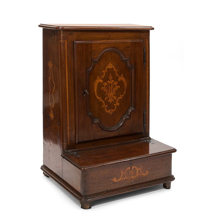 Inginocchiatoio in noce intarsiato in acero, Piemonte XVIII sec., a un'anta, all'interno ripiano e due tirettini con pomello in osso