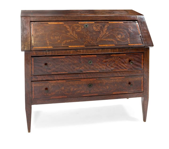CASSETTONE A RIBALTA Cassettone a ribalta, XIX secolo, in noce intarsiata a...