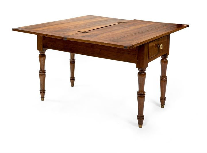 TAVOLO Tavolo a libro in noce bionda, epoca XIX secolo, un cassetto; gambe...