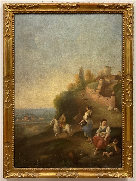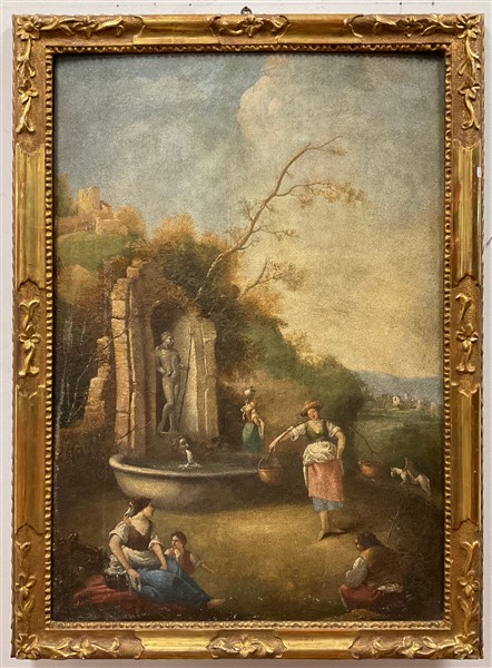 Scuola veneta del secolo XVIII "Paesaggi con figure" Coppia di dipinti ad olio