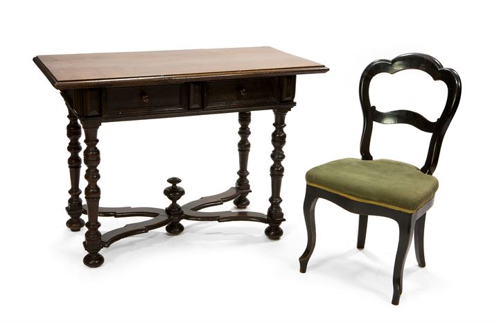 Scrittoio in noce, Piemonte, inizi XVIII sec., a due tiretti, gambe a rocchetto raccordate da traverse. Difetti sul piano e sulla fodera posteriore. Lo scrittoio è accompagnato da una sedia in legno ebanizzato, epoca Luigi Filippo, seconda metà XIX sec.