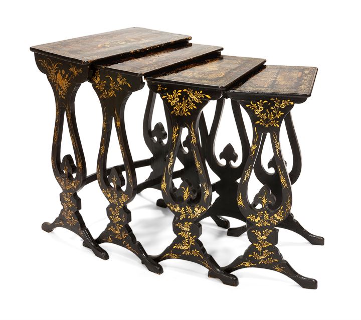 Tavolini a cicogna composti da quattro elementi, fine XIX secolo, laccati a fondo nero e dorato a motivi orientali