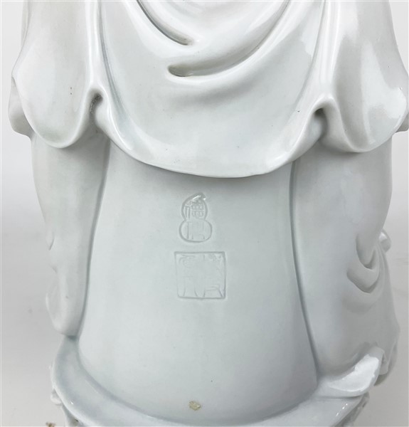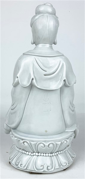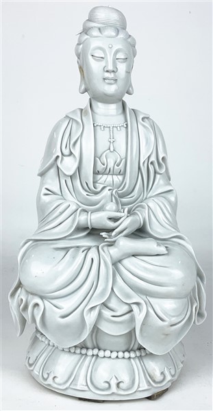 Statuetta in porcellana bianca raffigurante Guanyin con la perla sul trono di loto