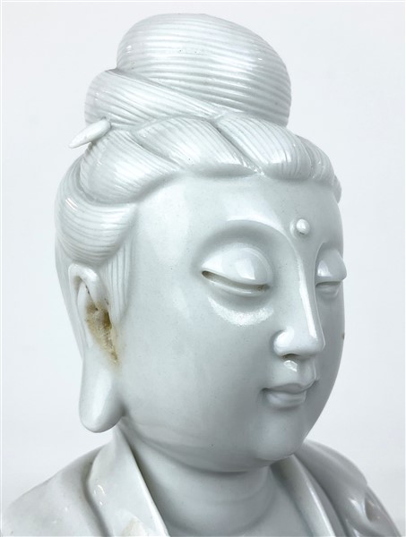 Statuetta in porcellana bianca Dehua raffigurante Guanyin con la perla poggiant